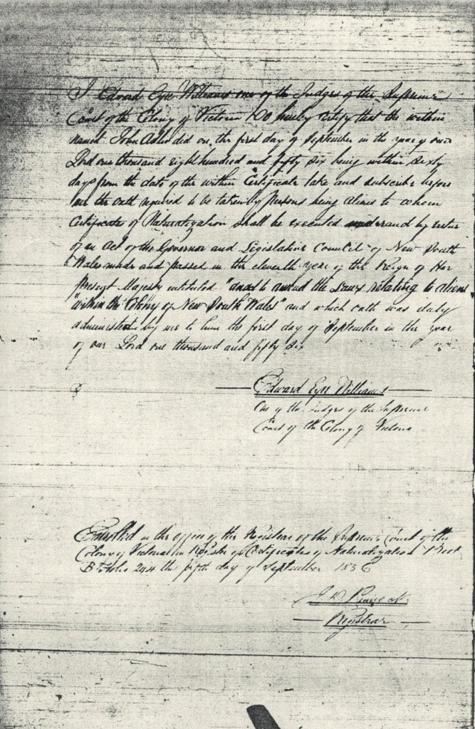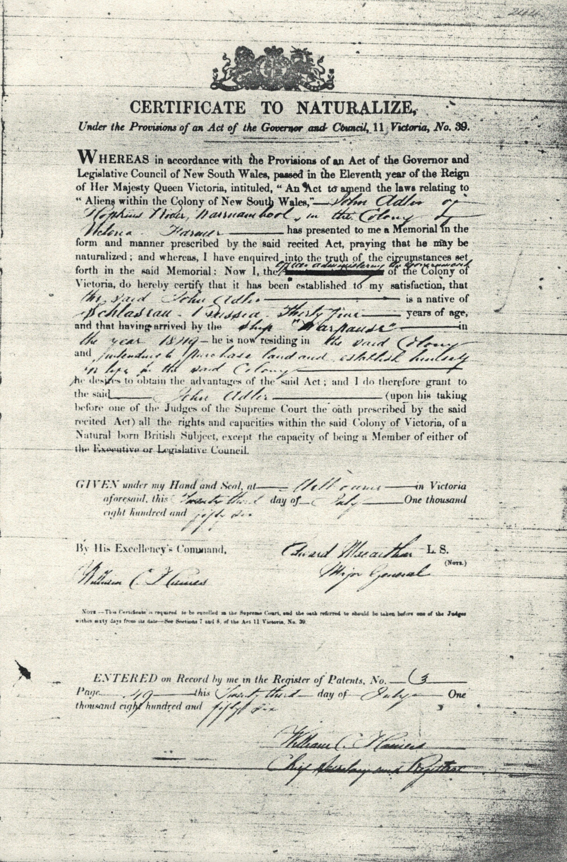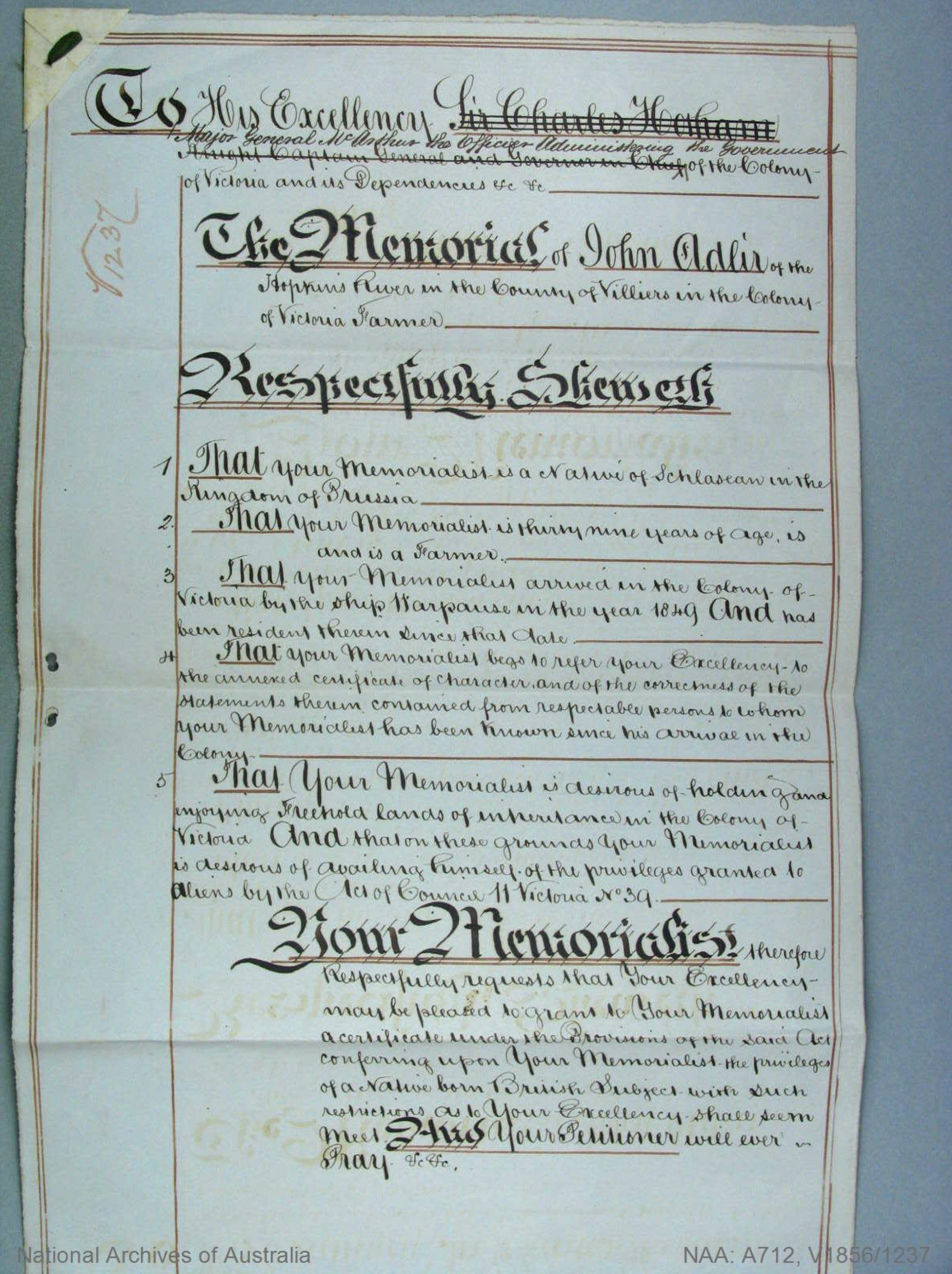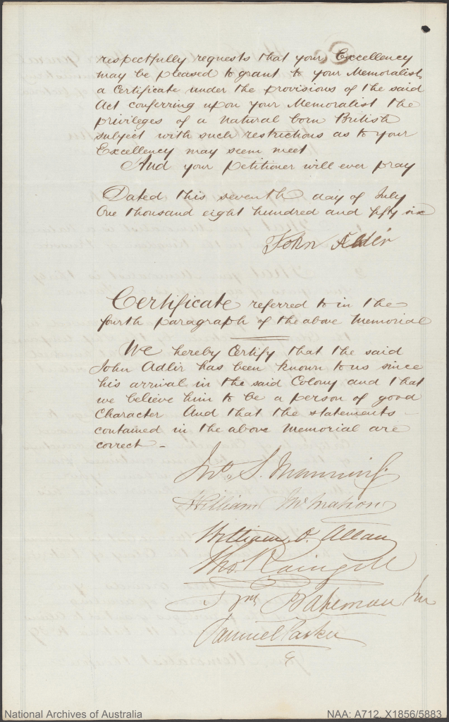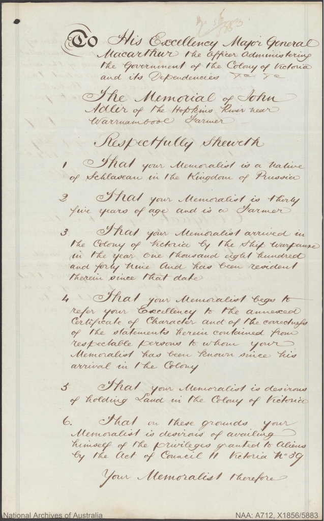 Documents and Memorabilia (1. ADLER) Memorial for Johann Gottlieb Adler, Hopkins River (Warrnambool), Vic., 1856 [Courtesy of National Archives of Australia/NAA/ A712, X1856/1237]. Memorial for Johann Gottlieb Adler, Hopkins River (Warrnambool), Vic., 1856 [Courtesy of National Archives of Australia/NAA/ A712, X1856/5883]. Certificate to Naturalize for Johann Gottlieb Adler, HJopkins River (Warrnambool), Vic. 1856.