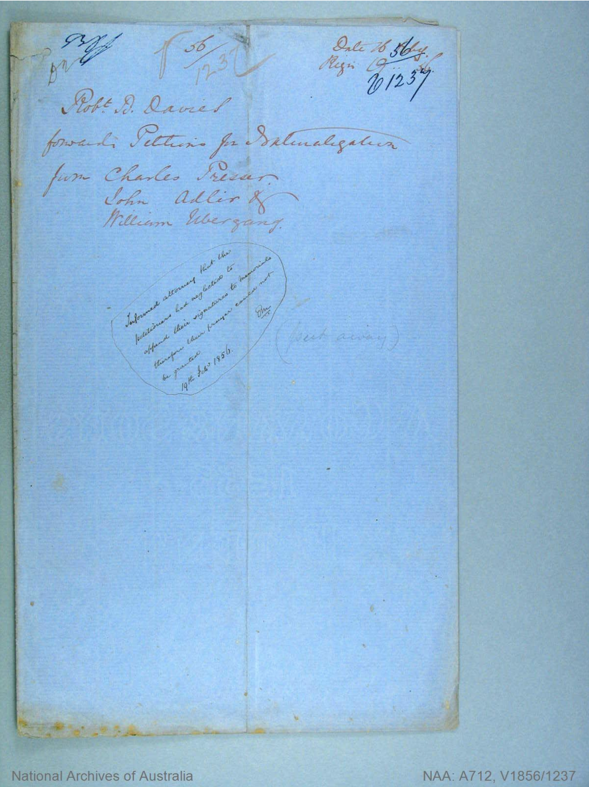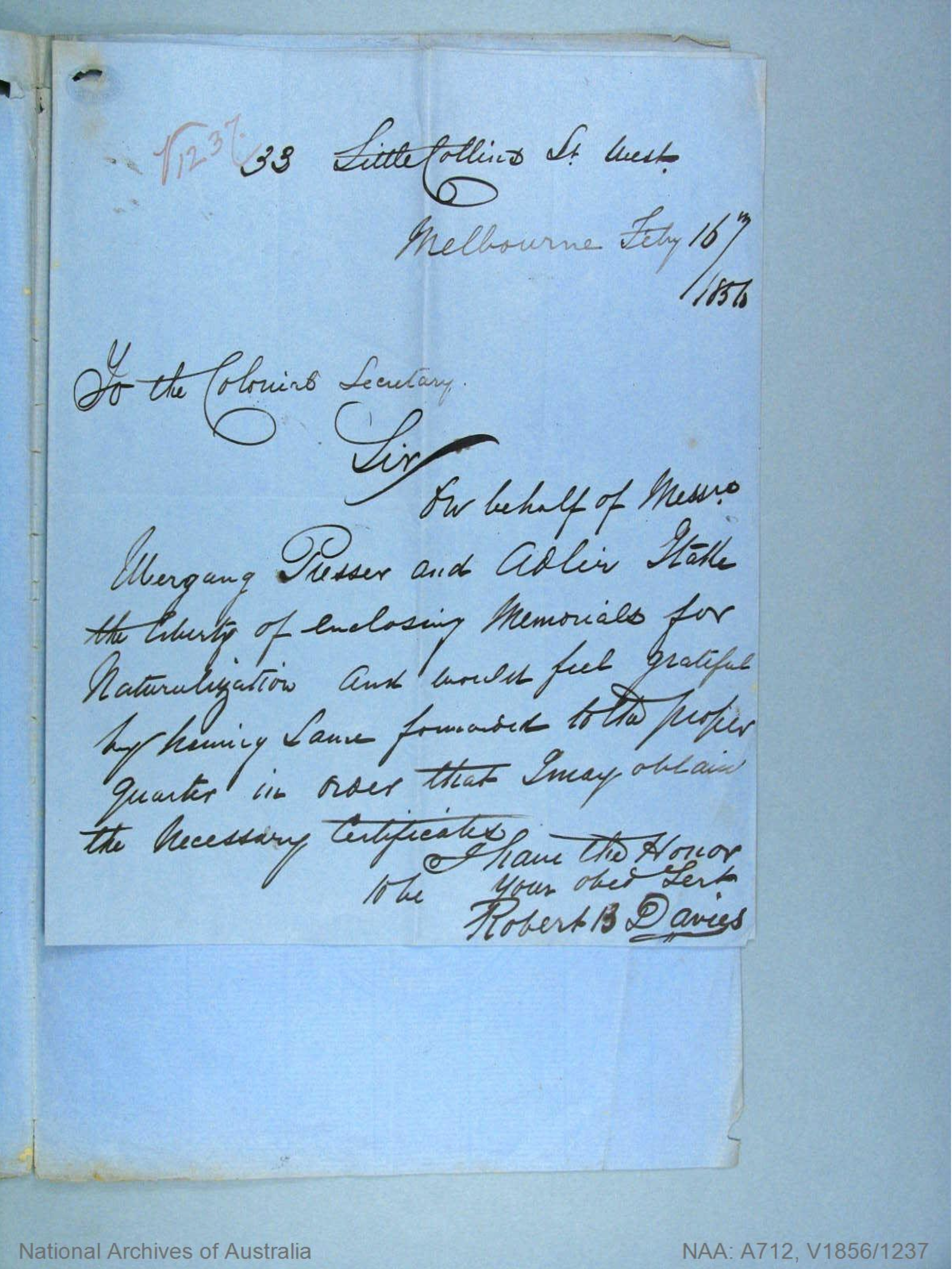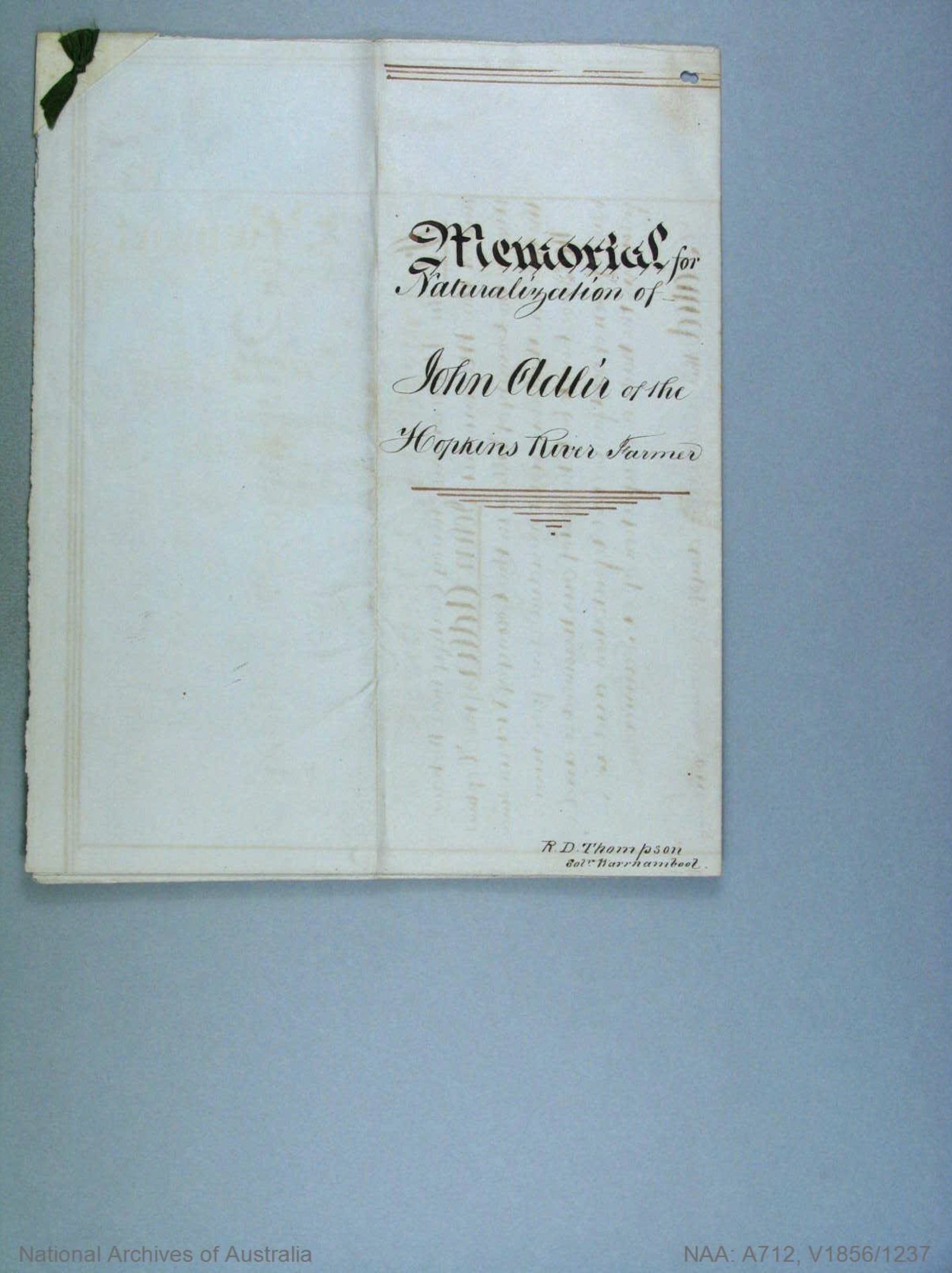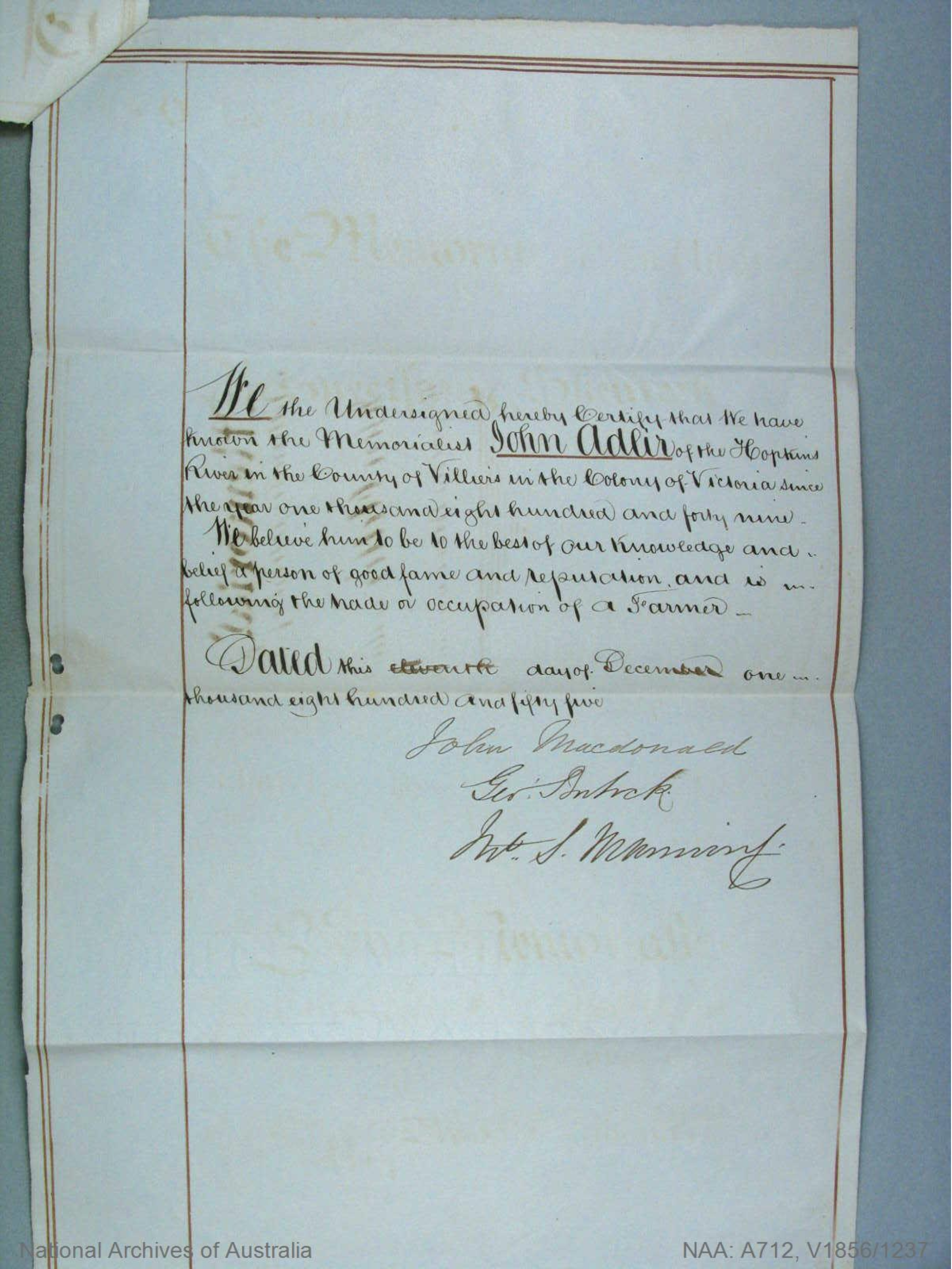 Documents and Memorabilia (1. ADLER) Memorial for Johann Gottlieb Adler, Hopkins River (Warrnambool), Vic., 1856 [Courtesy of National Archives of Australia/NAA/ A712, X1856/1237]. Memorial for Johann Gottlieb Adler, Hopkins River (Warrnambool), Vic., 1856 [Courtesy of National Archives of Australia/NAA/ A712, X1856/5883]. Certificate to Naturalize for Johann Gottlieb Adler, HJopkins River (Warrnambool), Vic. 1856.