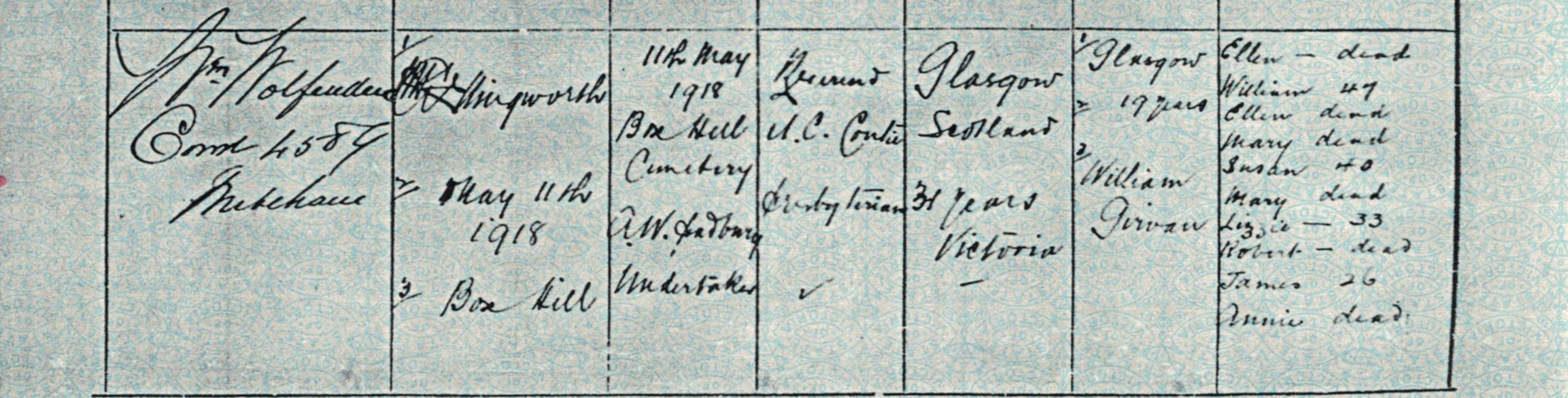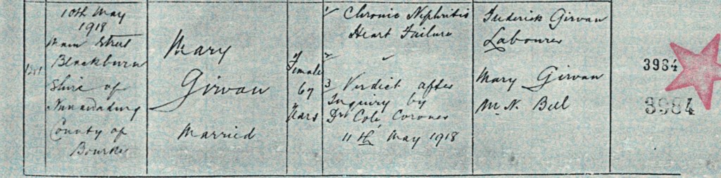 Documents and Memorabilia (1. GIRVAN) Death registration of Mary Girvan (Girvan), Blackburn, Vic., 1918 [BDMVic., 1992].