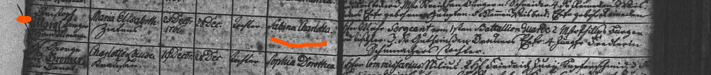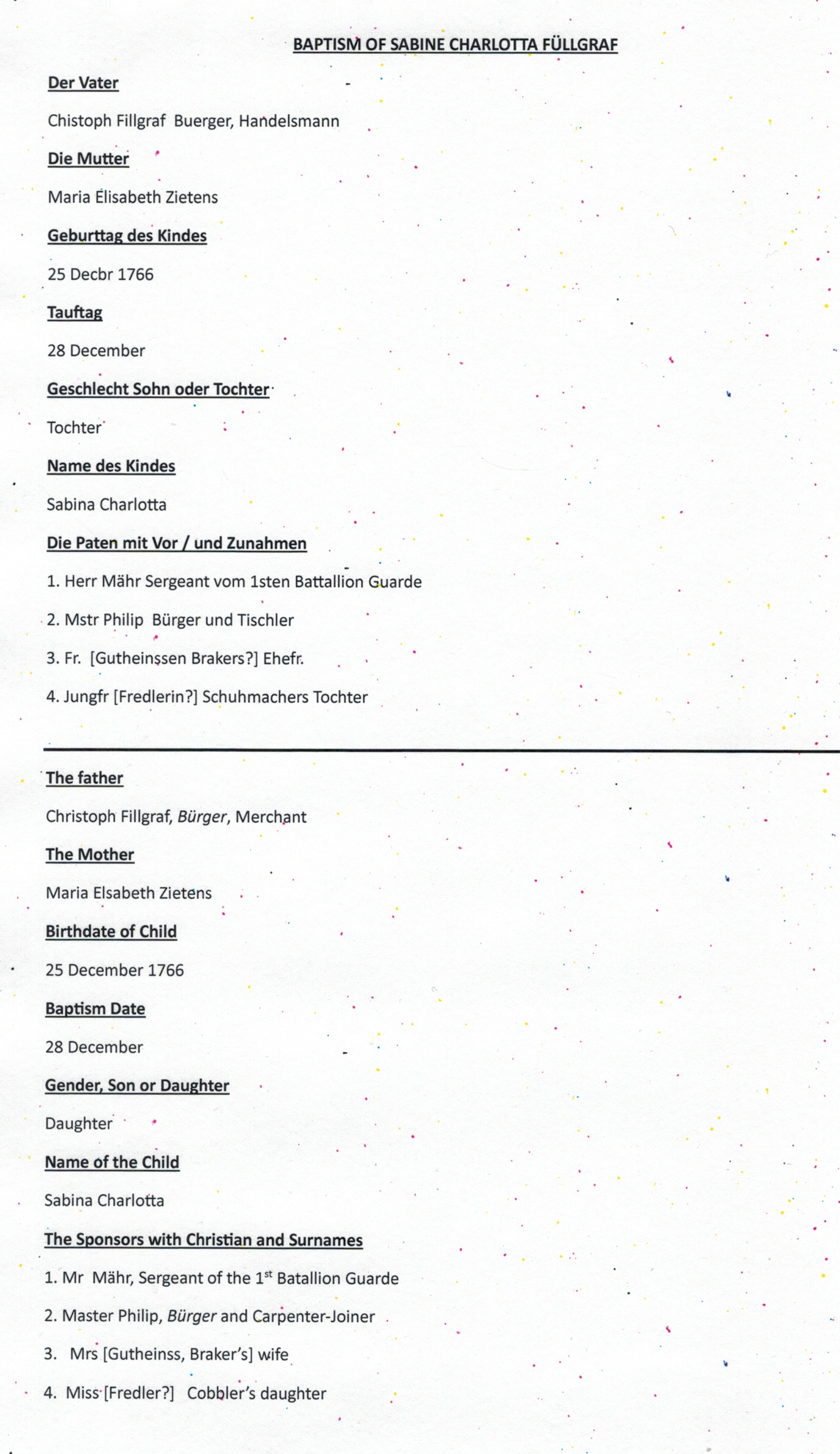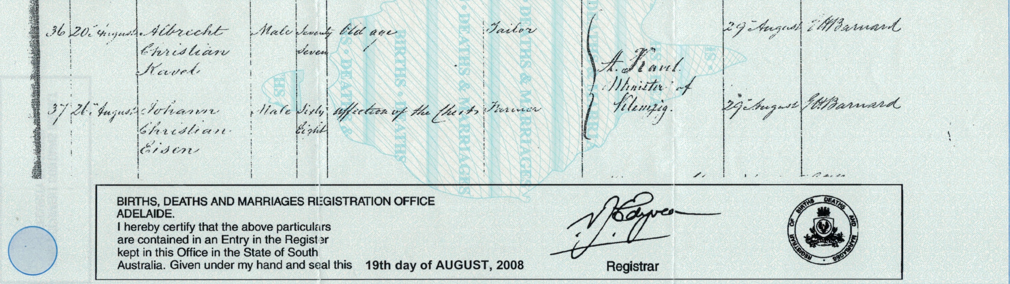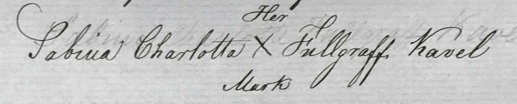 Baptismal record for Sabine Füllgraf (later Kavel), St. Nicholai, Potsdam, Germany, 1766 [Archion].Transcription and translation of above [Chris Greenthaner].Signatures of members of the Kavel family on the Document of Agreement signed by the Old Lutheran emigrants at Plymouth, 28 July, 1838: Albrecht, August (Pastor), Fritz, Ferdinand and Daniel (SLSA PRG 174/33).Death registration of Albrecht Kavel, Klemzig, SA, 1842 [BDMSA: Deaths in the District of Adelaide, South Australia, 1842; 6th column, cause of death; 7th column, occupation; 8th column informant, Pastor Kavel; 9th/10th column, registration].A legal declaration signed with an “X” by Sabine Kavel (Füllgraf), Tanunda, 24 February, 1852 [State Library of South Australia, Piper, Bakewell, Piper Index BRG 73/768/5].