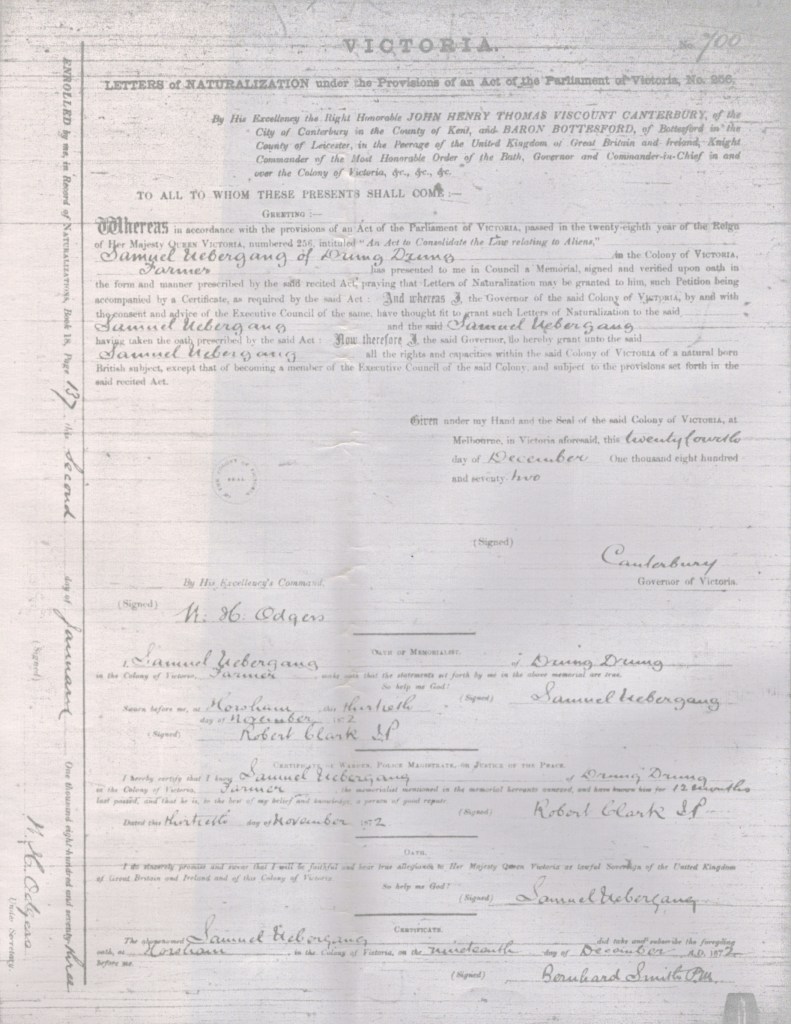Documents and Memorabilia (1. UEBERGANG) Letters of Naturalization for Samuel Uebergang, Drung Drung, Vic., 1872.