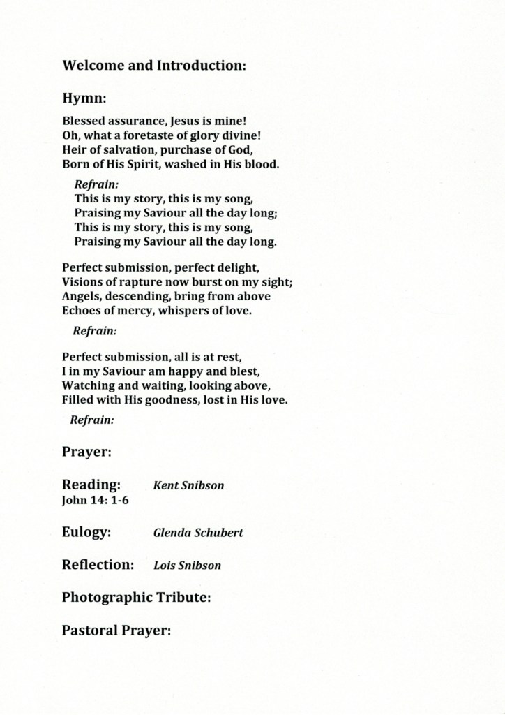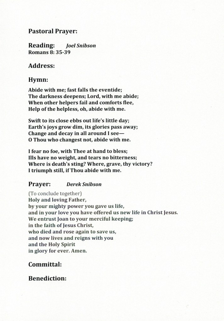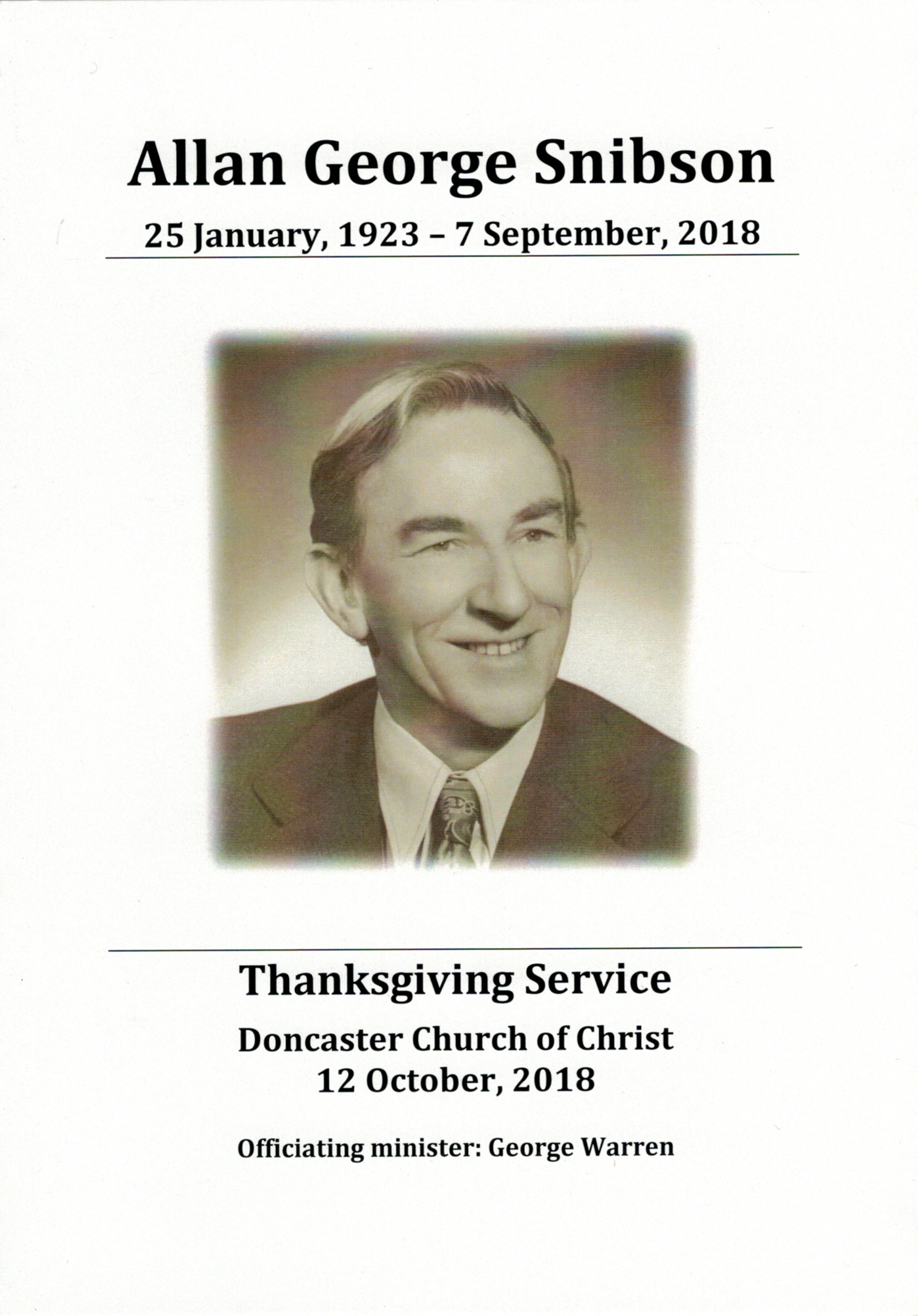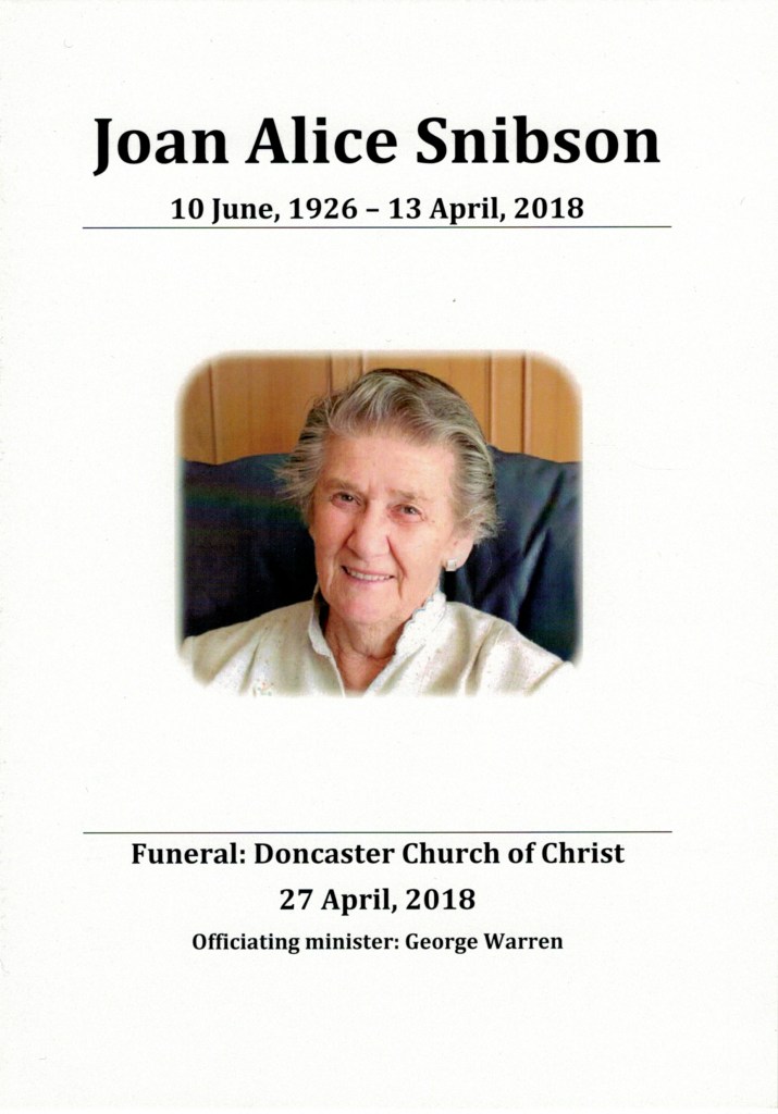 Documents and Memorabilia (1.6.1.2 SNIBSON) Funeral service order for Joan Snibson (Corrie), Doncaster, 2018. Funeral service order for Allan Snibson, Doncaster, 2018.