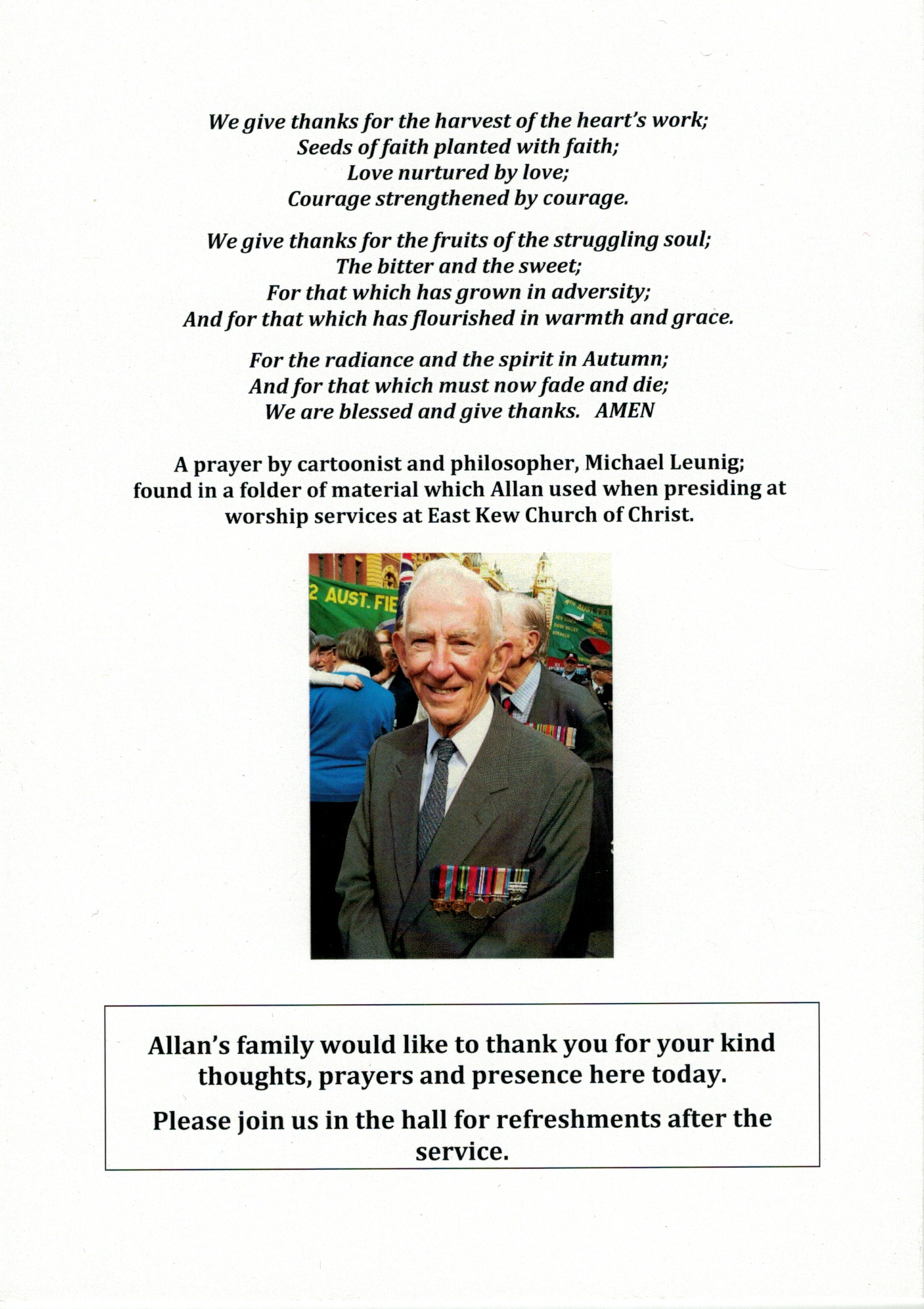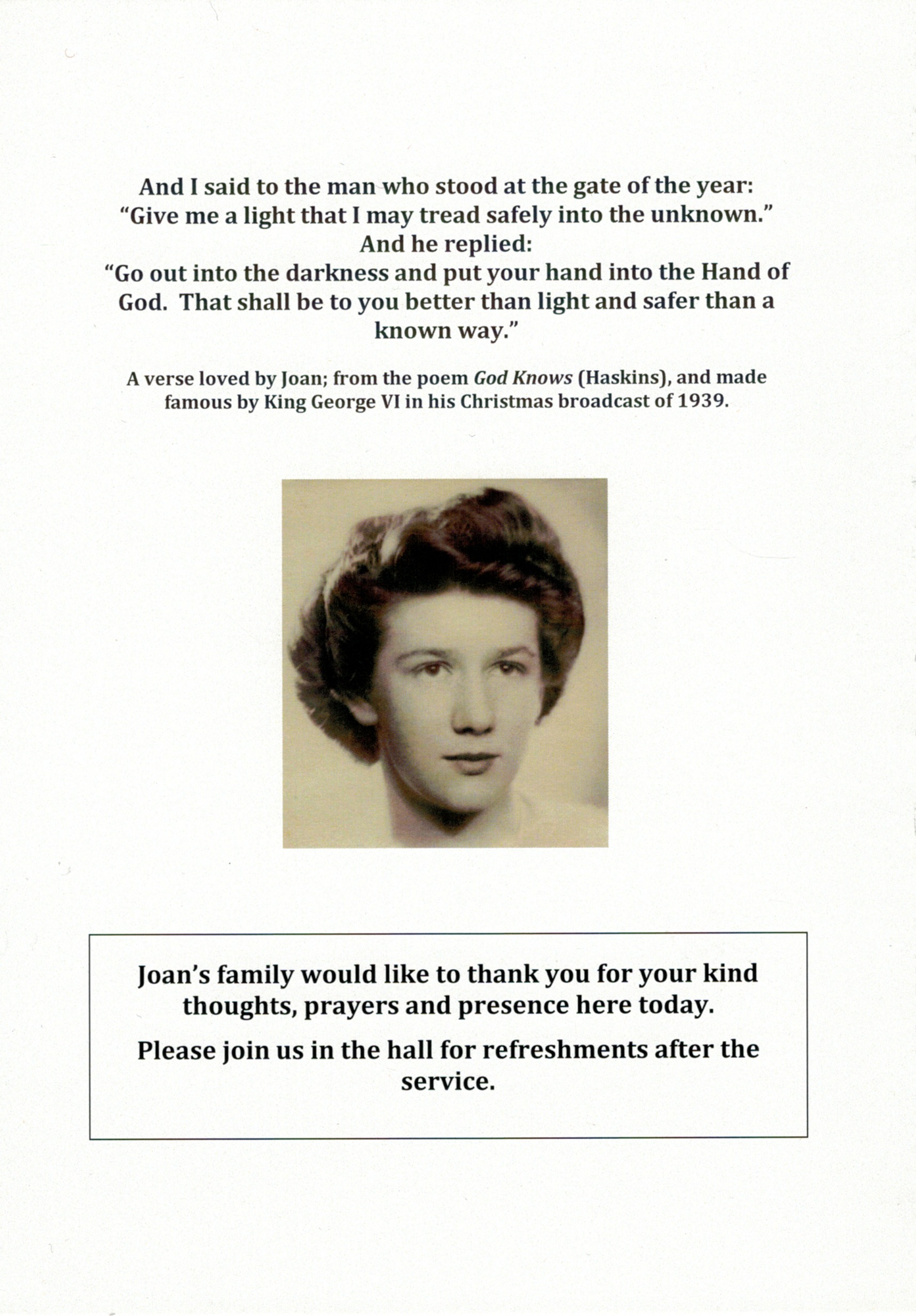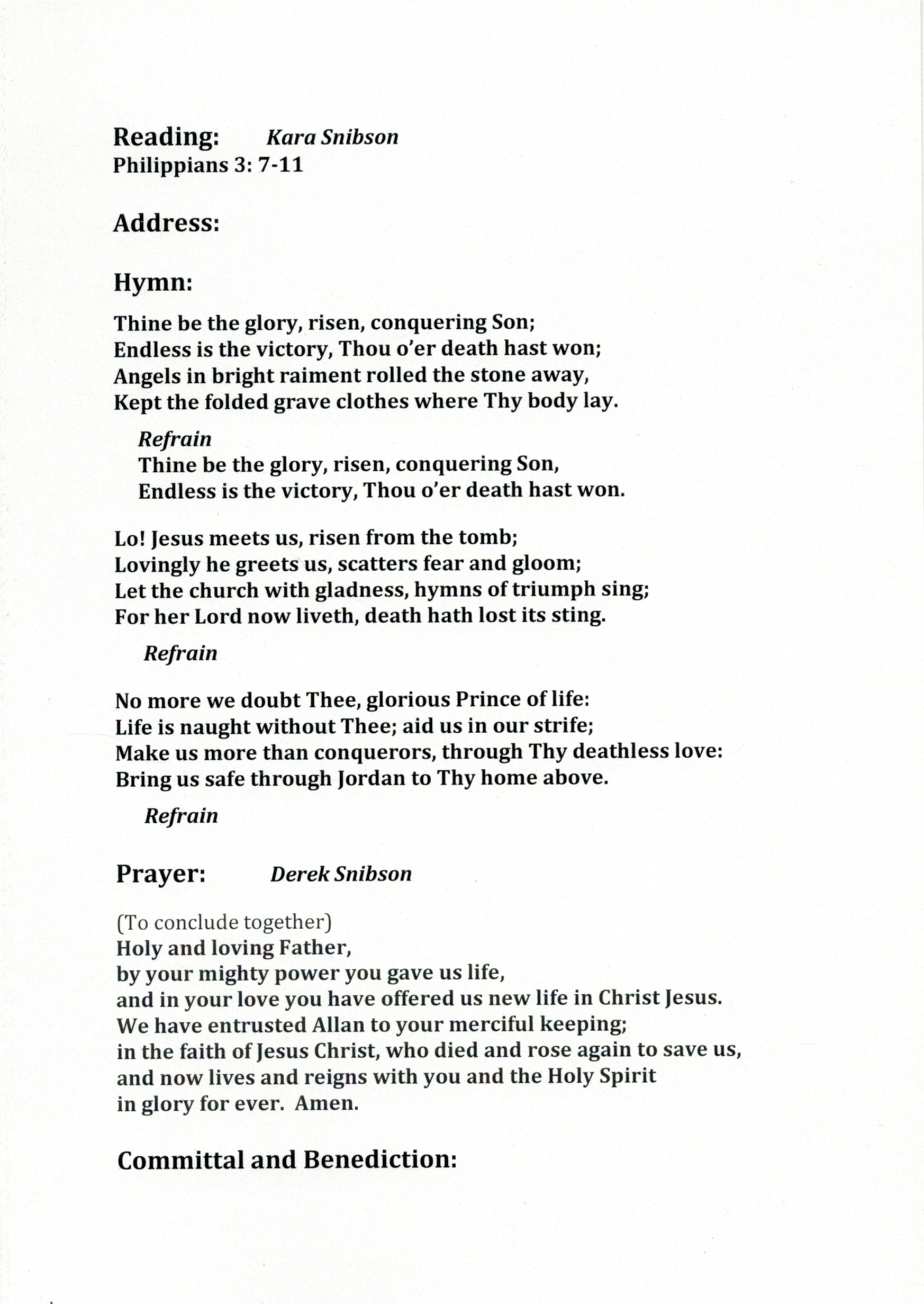Documents and Memorabilia (1.6.1.2 SNIBSON) Funeral service order for Joan Snibson (Corrie), Doncaster, 2018. Funeral service order for Allan Snibson, Doncaster, 2018.