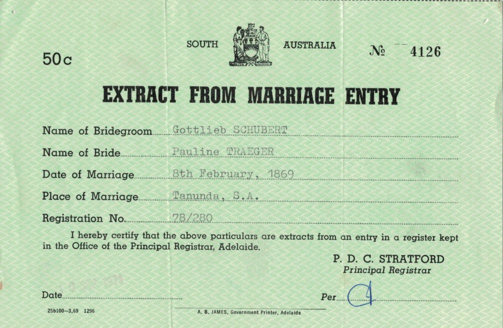 Documents & Memorabilia (1.6 SCHUBERT) Extract of marriage certificate for Gottlieb and Polly Schubert (Traeger) [BDMSA][Reg Munchenberg].