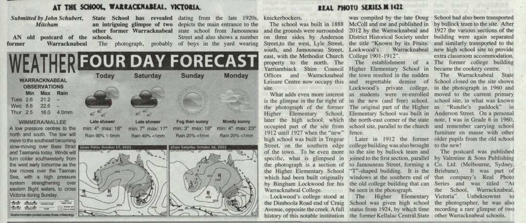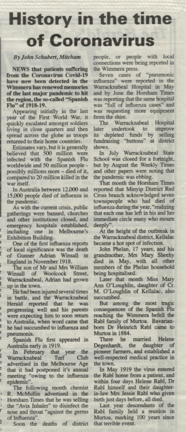 Historical Articles “Warracknabeal Herald” (Vic.), Friday 3 April 2020, page 3. Republished in “Nhill Free Press and Kaniva Times” (Vic.), Wednesday 22 April 2020, page 9. “Warracknabeal Herald” (Vic.), Tuesday 8 September 2020, page 6. “Warracknabeal Herald” (Vic., Friday 15 October 2021, page 2.