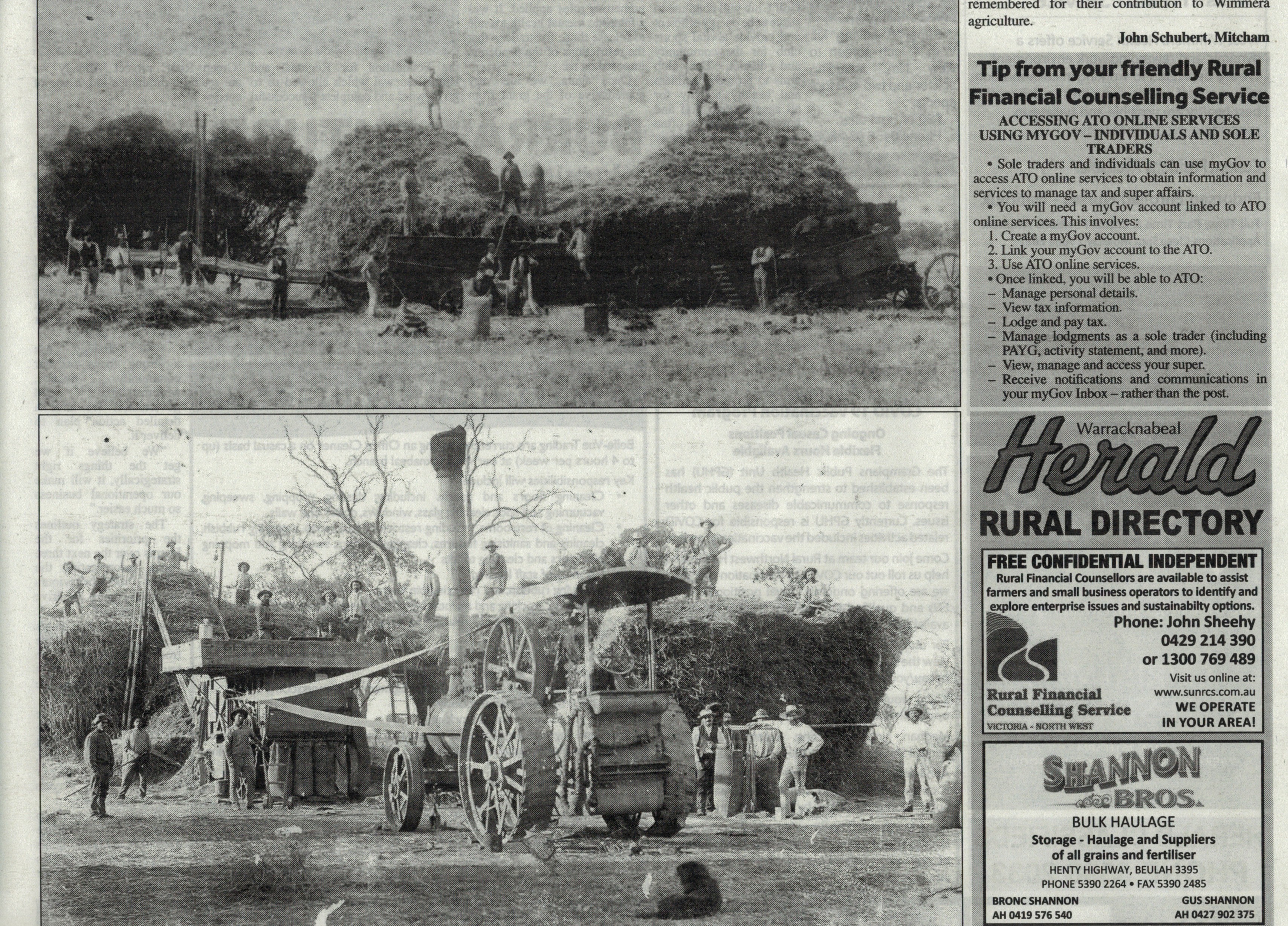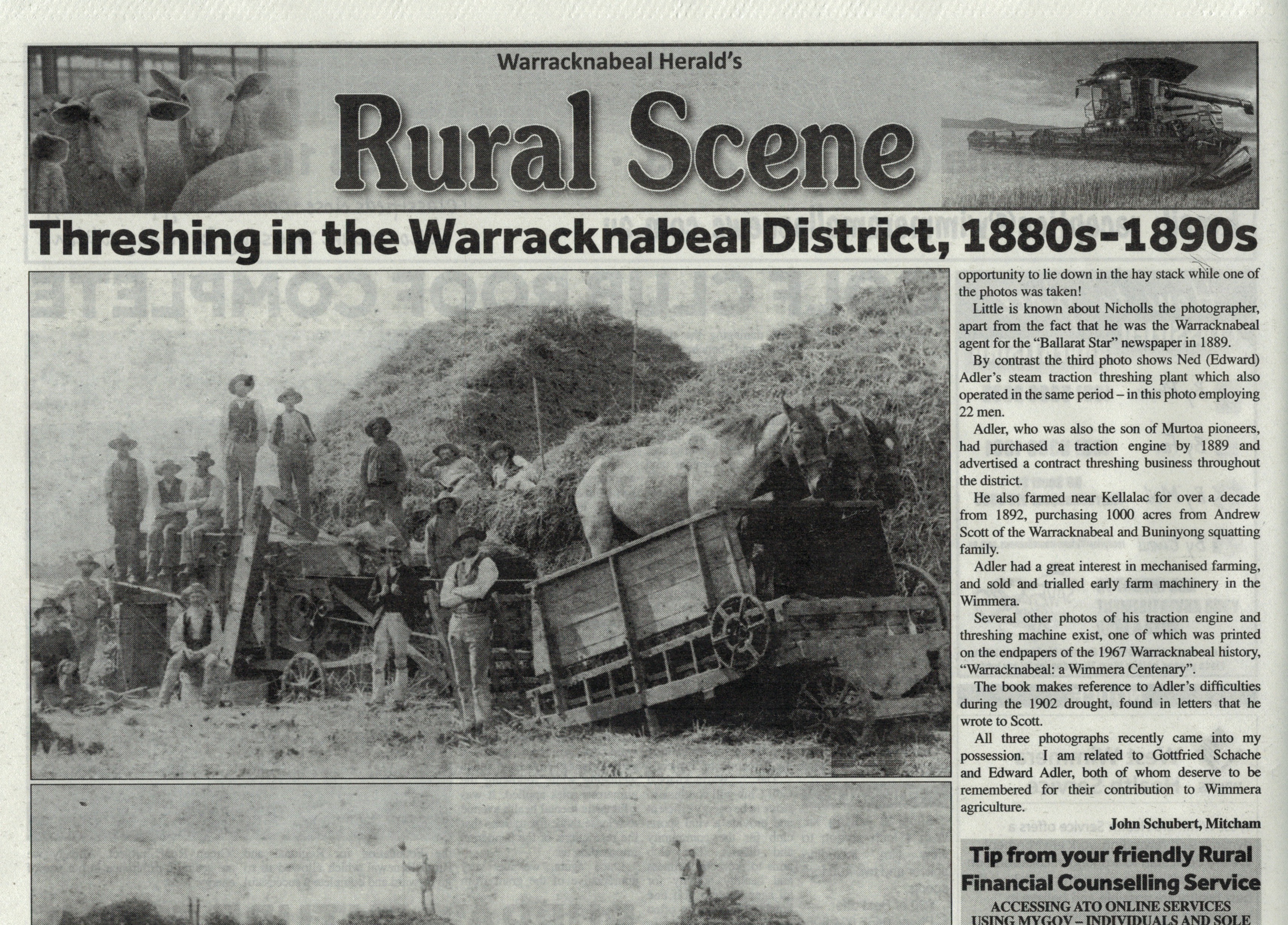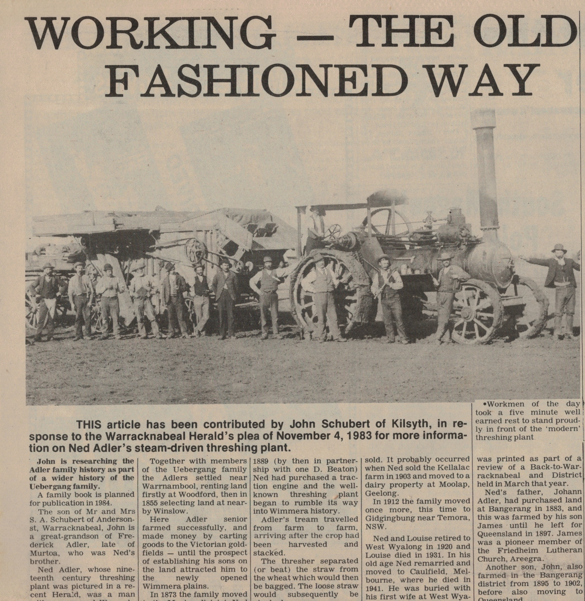 Ned Adler’s steam-driven threshing plant at Kellalac (either at Adler’s or Mrs Dan Robinson’s parents’ farm), 1880s-1890s, with driver Tommy Farrell in the cabin; reproduced on endpapers in Susan Priestley, “Warracknabeal A Wimmera Centenary”, 1967.Ned Adler’s steam-driven threshing plant at “Union Farm”, Murtoa, Vic., 1890 (identified by Ossie Schache); this photograph has also been identified as William Hunter’s property at Ailsa via Warracknabeal, Vic. (Bruce Hunter).“Warracknabeal Herald” (Vic.), Friday 4 November 1983.“Warracknabeal Herald” (Vic.), Tuesday 17 January 1984 [JAS].“Adler’s Steam Thrashing Machine at work at Home, Waruda, Kellalac, near Warracknabeal, 1896”; copied from a large framed photograph at North-Western Agricultural Machinery (now Wheatlands) Museum Warracknabeal, Vic., 1981.Believed to be Edward (Ned )Adler’s steam-driven threshing plant, Murtoa or Warracknabeal districts Vic., c1880s-1890s [David Schache].“Warracknabeal Herald” (Vic,), Tuesday 25 May 2021, page 7 [JAS].Believed to be Ned Adler’s steam-driven threshing plant, Murtoa or Warracknabeal districts Vic., 1880s-1890s [David Schache].Ned Adler’s steam-driven threshing plant [Murtoa Centenary reprint, 1972].Ned Adler’s steam-driven threshing plant (Selma Schache (Adler).