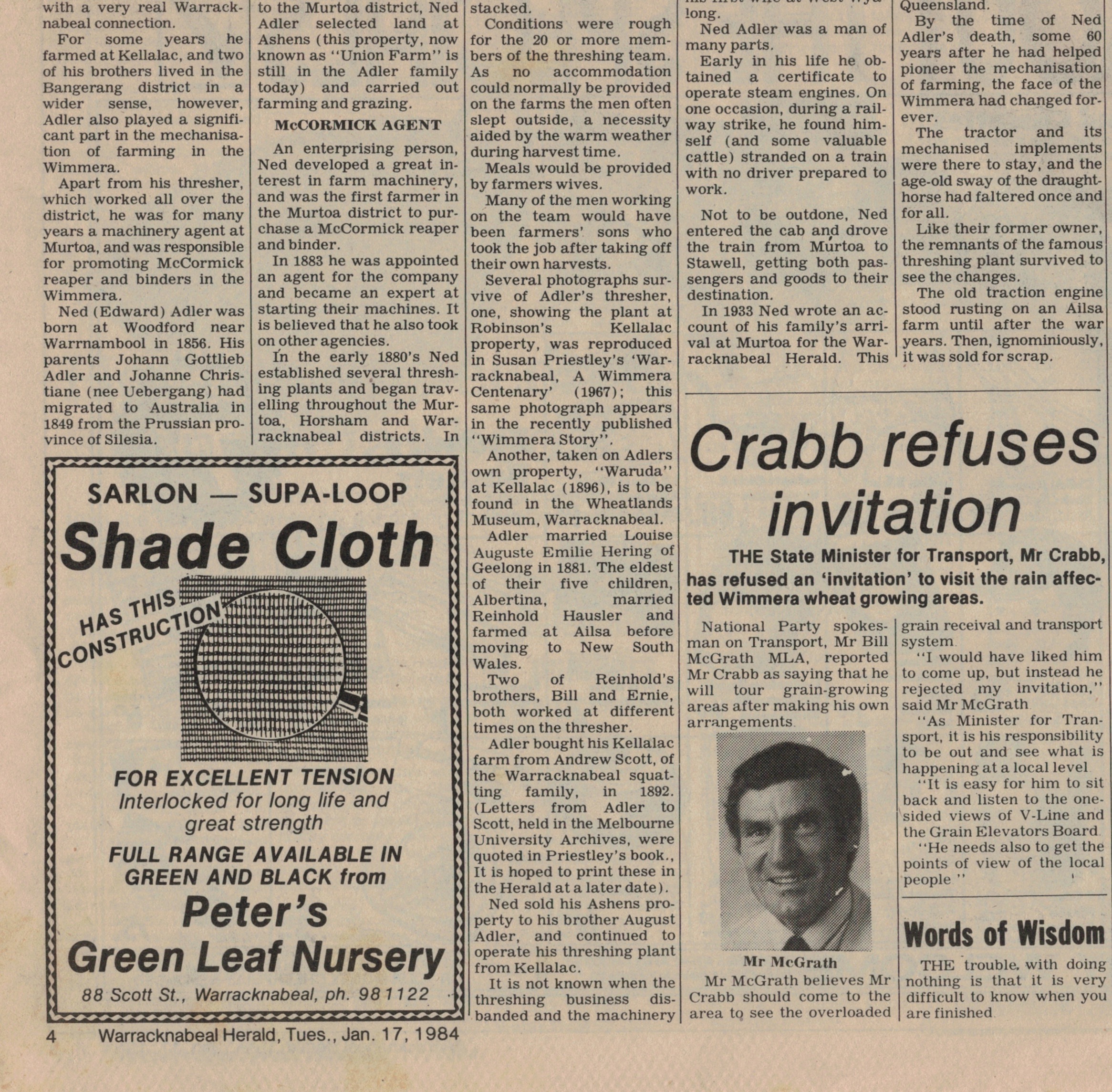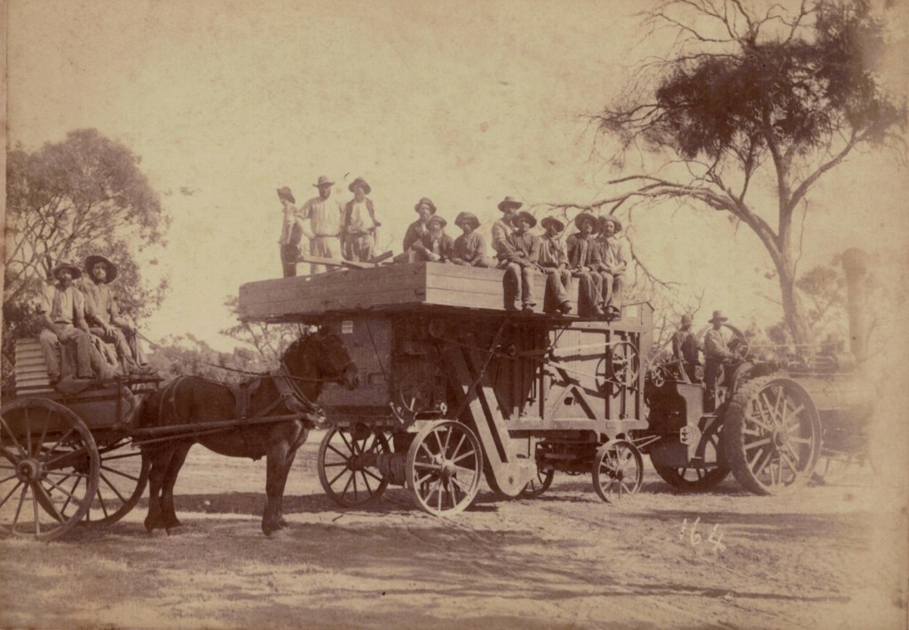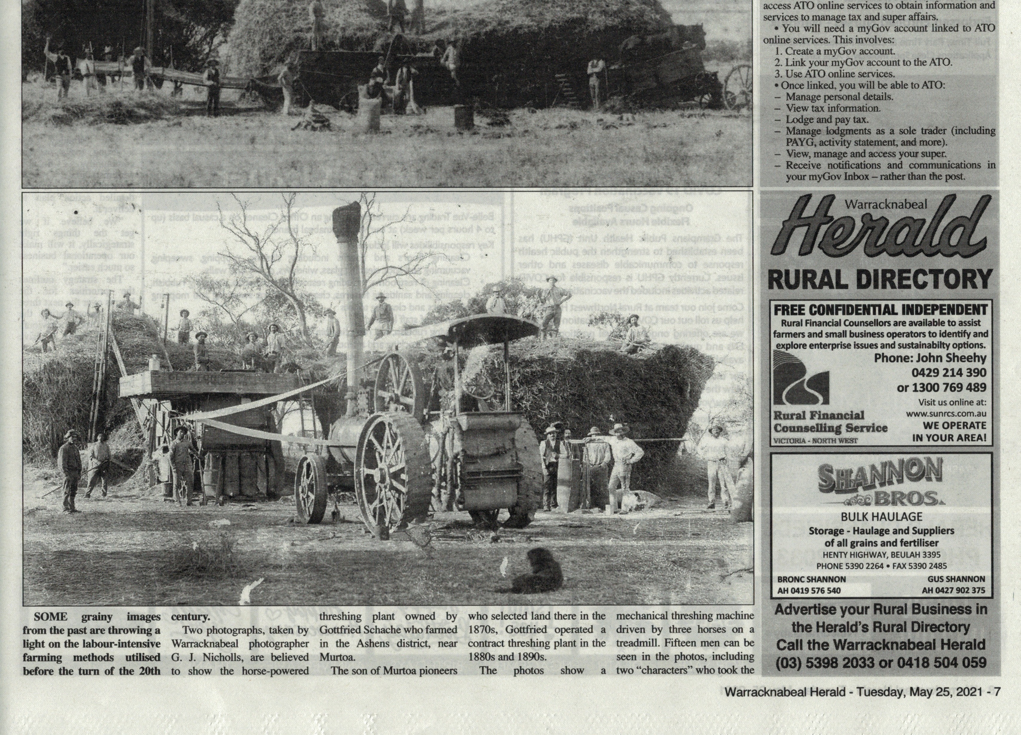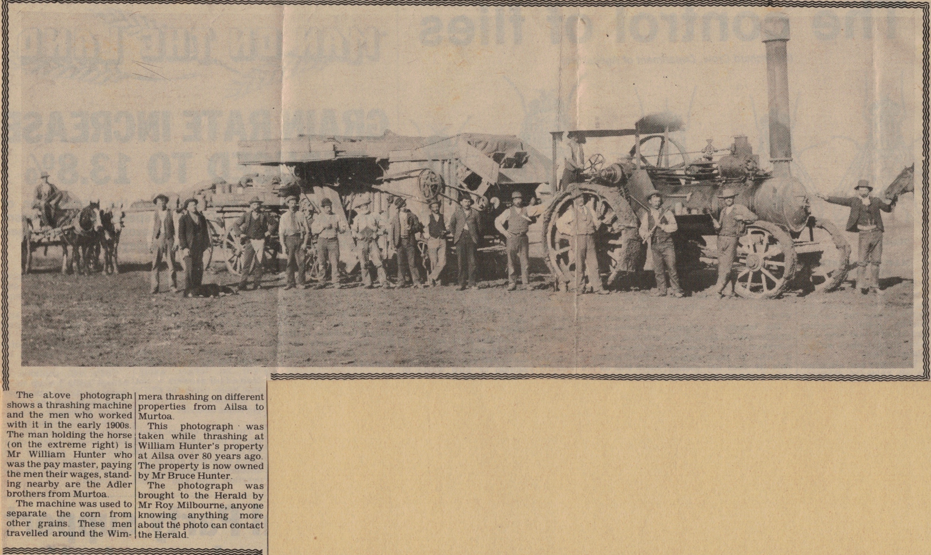 Ned Adler’s steam-driven threshing plant at Kellalac (either at Adler’s or Mrs Dan Robinson’s parents’ farm), 1880s-1890s, with driver Tommy Farrell in the cabin; reproduced on endpapers in Susan Priestley, “Warracknabeal A Wimmera Centenary”, 1967.Ned Adler’s steam-driven threshing plant at “Union Farm”, Murtoa, Vic., 1890 (identified by Ossie Schache); this photograph has also been identified as William Hunter’s property at Ailsa via Warracknabeal, Vic. (Bruce Hunter).“Warracknabeal Herald” (Vic.), Friday 4 November 1983.“Warracknabeal Herald” (Vic.), Tuesday 17 January 1984 [JAS].“Adler’s Steam Thrashing Machine at work at Home, Waruda, Kellalac, near Warracknabeal, 1896”; copied from a large framed photograph at North-Western Agricultural Machinery (now Wheatlands) Museum Warracknabeal, Vic., 1981.Believed to be Edward (Ned )Adler’s steam-driven threshing plant, Murtoa or Warracknabeal districts Vic., c1880s-1890s [David Schache].“Warracknabeal Herald” (Vic,), Tuesday 25 May 2021, page 7 [JAS].Believed to be Ned Adler’s steam-driven threshing plant, Murtoa or Warracknabeal districts Vic., 1880s-1890s [David Schache].Ned Adler’s steam-driven threshing plant [Murtoa Centenary reprint, 1972].Ned Adler’s steam-driven threshing plant (Selma Schache (Adler).