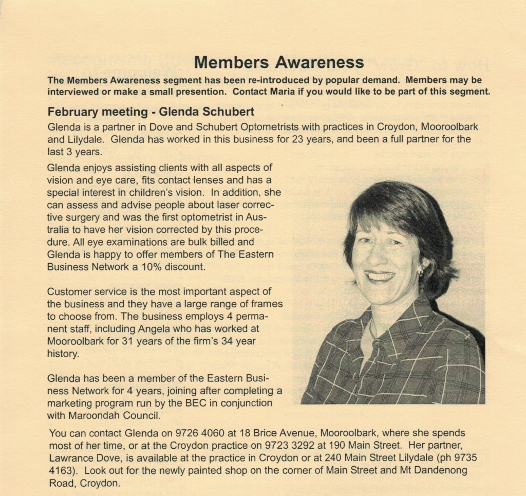 OPTOMETRY “Network News” (Swinburne Business Enterprise Centre, Croydon, Vic.), Issue 2, April 2002, page 4. “Living Today” (Mooroolbark, Vic.), June 2021, pages 12-13.