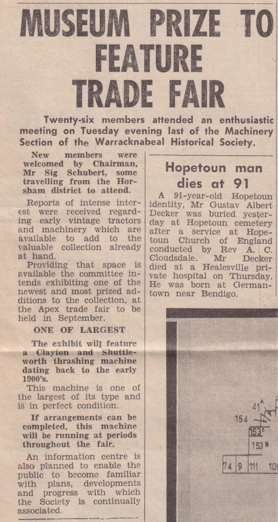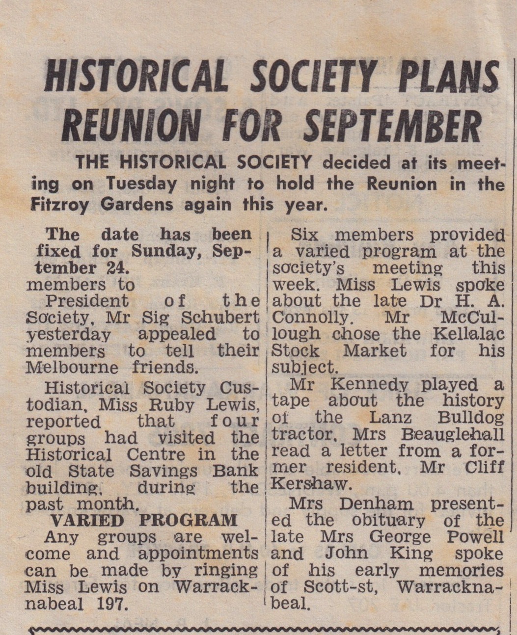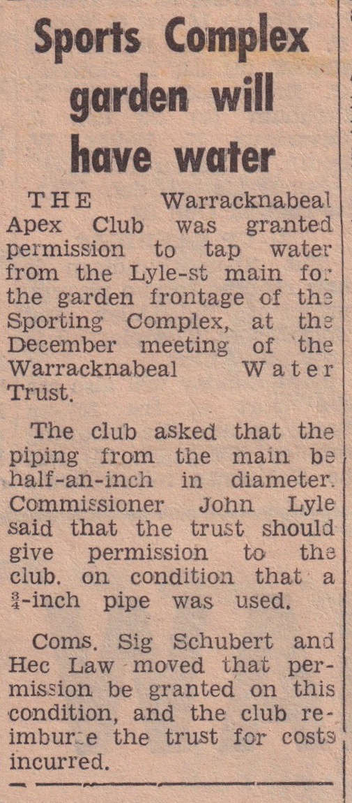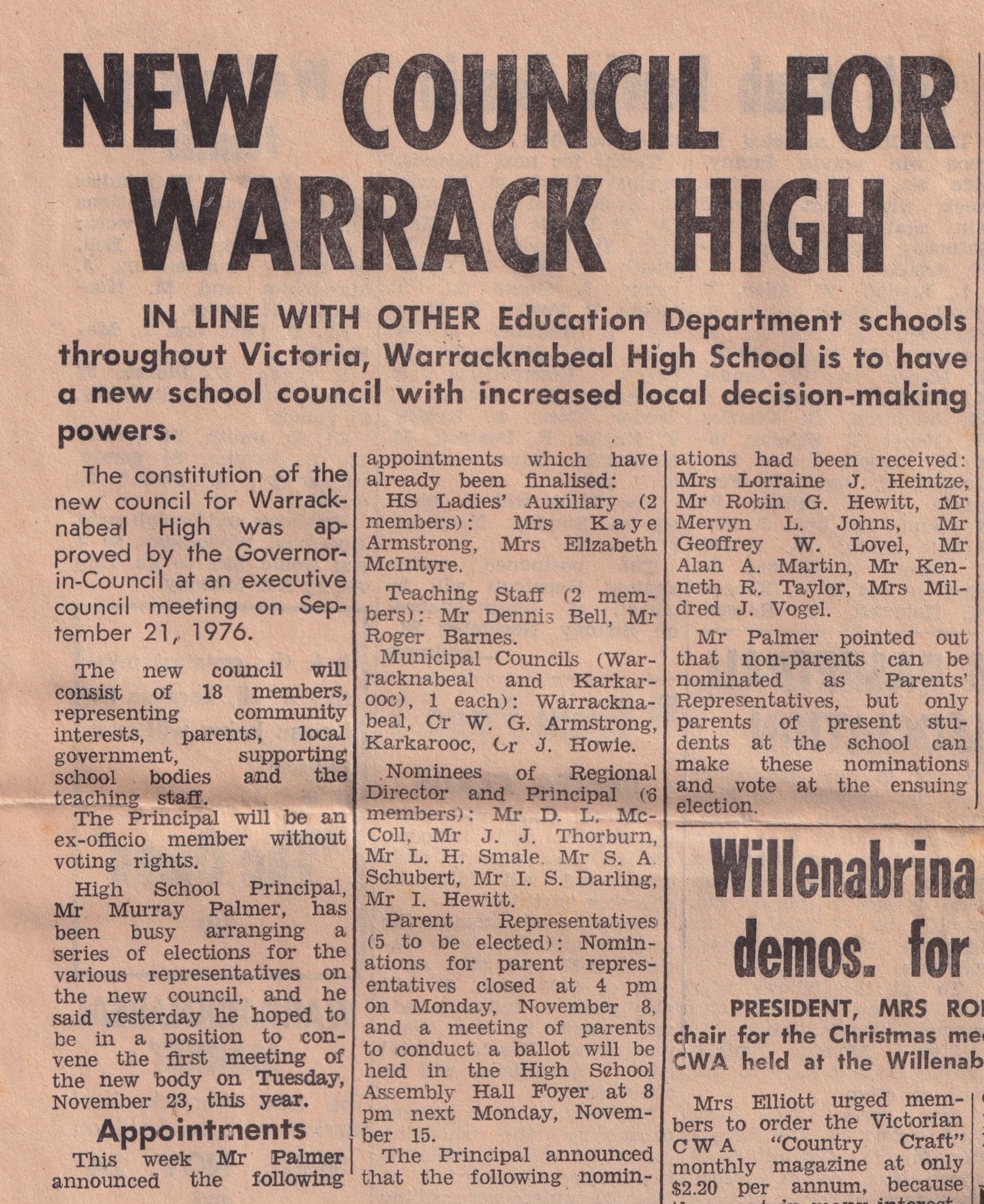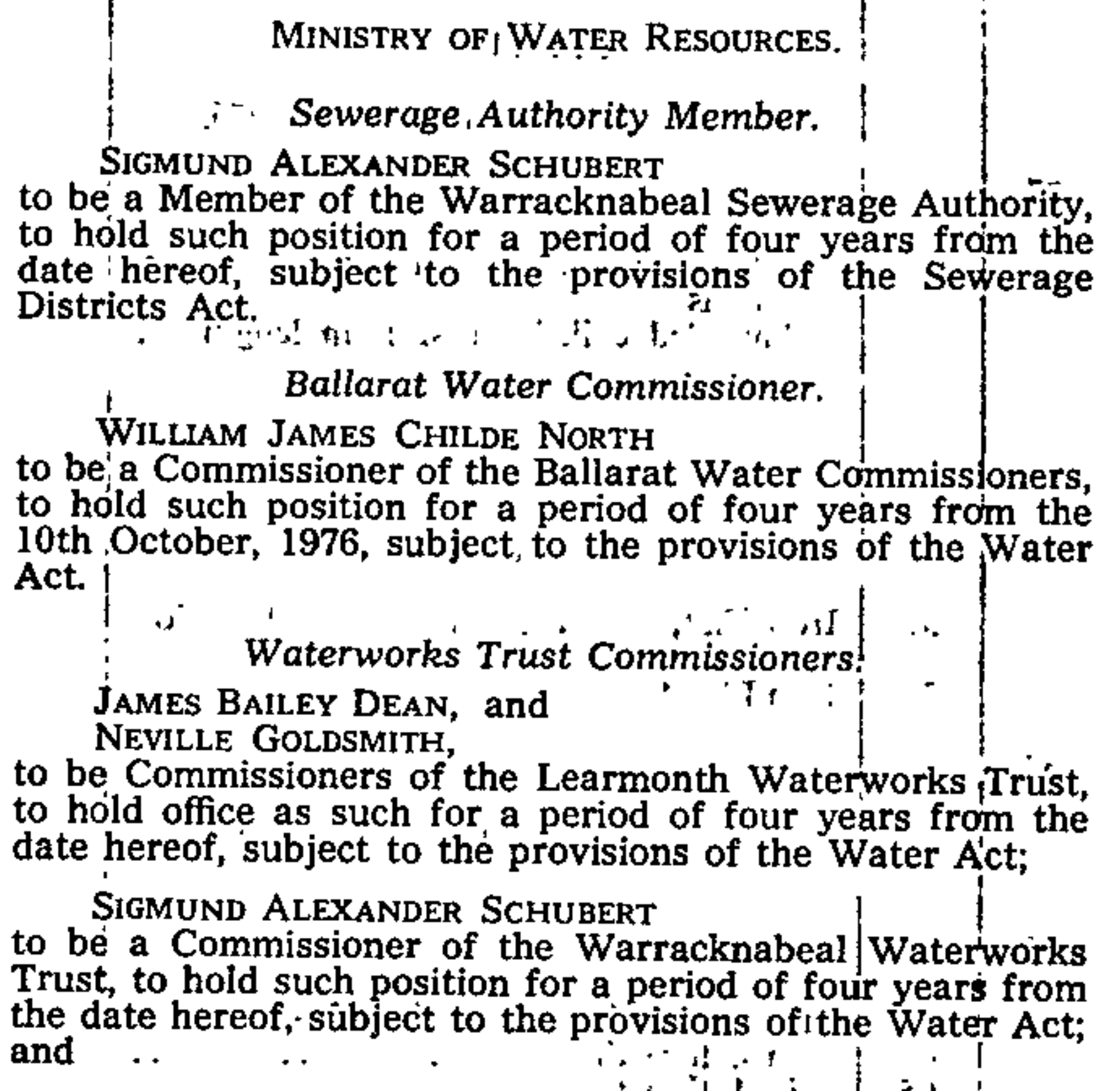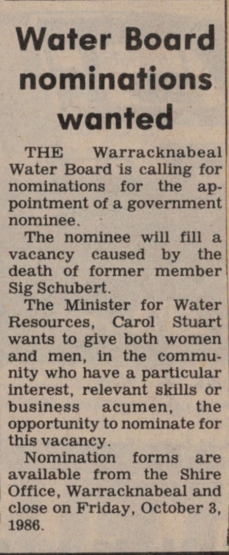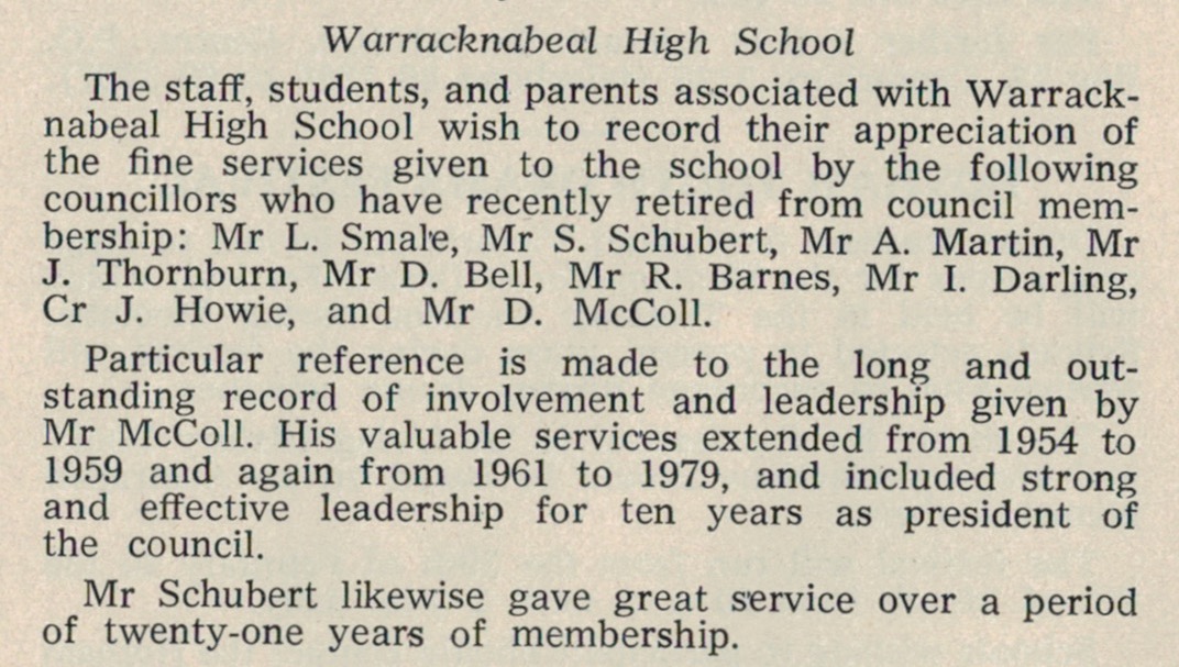 Other Community Involvement (1.6.8.5 SCHUBERT) “Warracknabeal Herald” (Vic.), Tuesday 30 July 1968. “Warracknabeal Herald” (Vic.), Friday 23 June 1972. Victorian Government Gazette, 13. October 1976, page 3012. “Warracknabeal Herald” (Vic.), Friday 12 November 1976, page 3. “Warracknabeal Herald” (Vic.), Friday 10 December 1976, page 7. “Warracknabeal Herald” (Vic.), Friday 10 December 1976, page 12. “Education Gazette and Teachers’ Aid” (Melbourne, Vic.), 31 January 1980, page 56 (extract from section “School Councils/ Appreciation of Services”). “Warracknabeal Herald” (Vic.), Friday 19 September 1986, page 10.