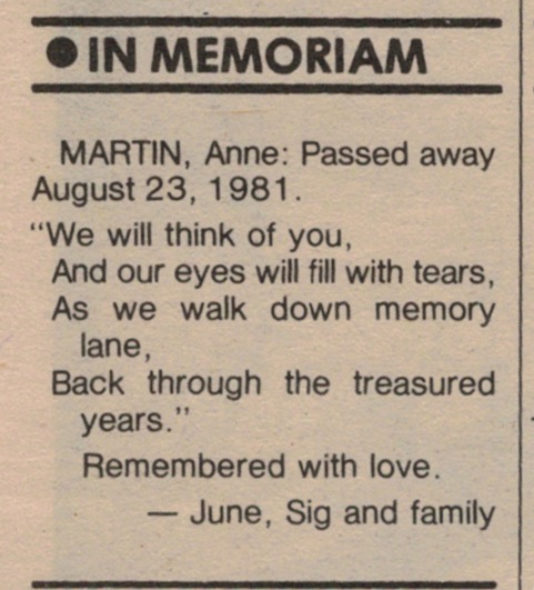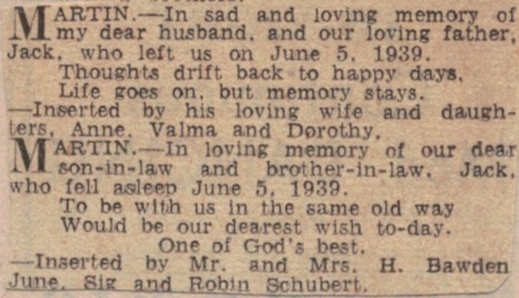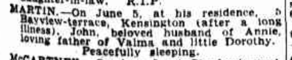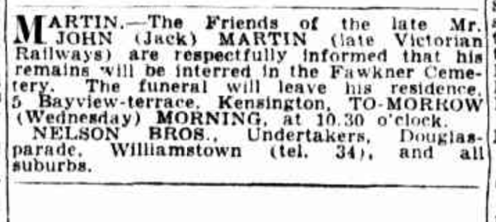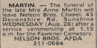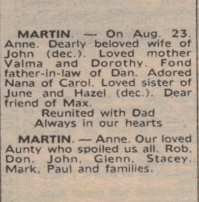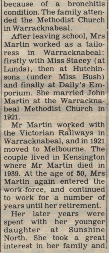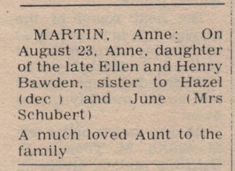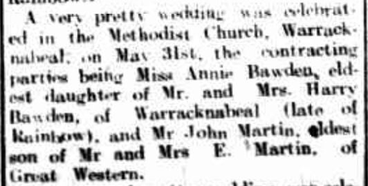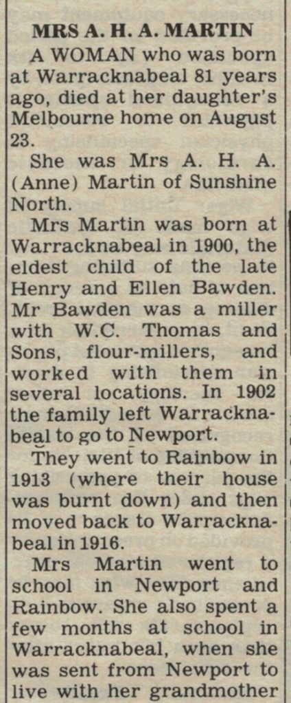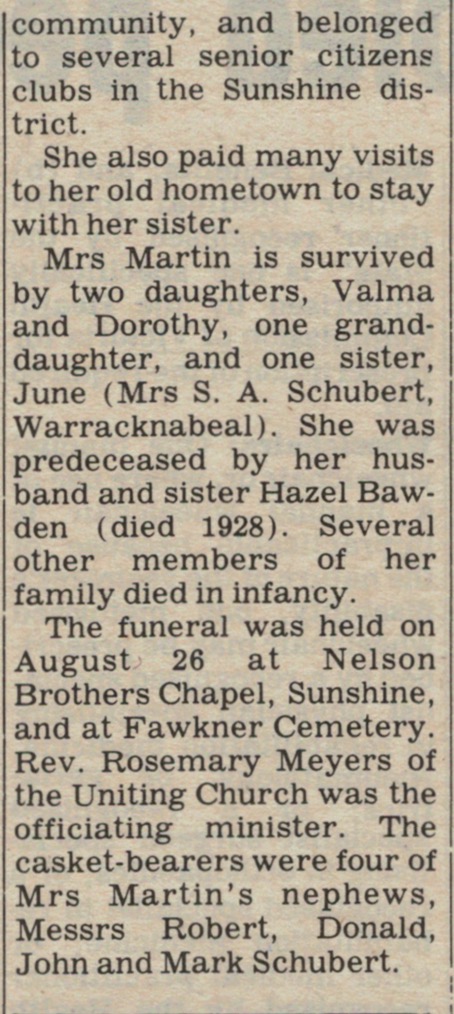 Press References (1.1.1.1 BAWDEN) “Warracknabeal Herald” (Vic.), Tuesday 7 June 1921. “Horsham Times” (Vic.), Friday 10 June 1921, page 5. “Age” (Melbourne, Vic.), Tuesday 6 June 1939, page 1 (“Deaths”). “Age” (Melbourne, Vic.), Tuesday 6 June 1939, page 1 (“Funeral Notices”). (Melbourne, Vic.) c. June 1942. “Sun” (Melbourne, Vic.), Tuesday 25 August, 1981, page 72 (“Deaths”); first notice also published in the same paper Monday 24 August and Wednesday 26 August 1981 (page 75). “Sun” (Melbourne, Vic.), Monday, 24 August 1981 (“Funeral Notices”), page 68 “Warracknabeal Herald” (Vic.), Friday 28 August 1981, page 9. “Warracknabeal Herald” (Vic.), Friday 11 September 1981, page 5 (extract from article “District Obituaries”) [JAS]. “Warracknabeal Herald” (Vic.), Friday 20 August 1981, page 9.