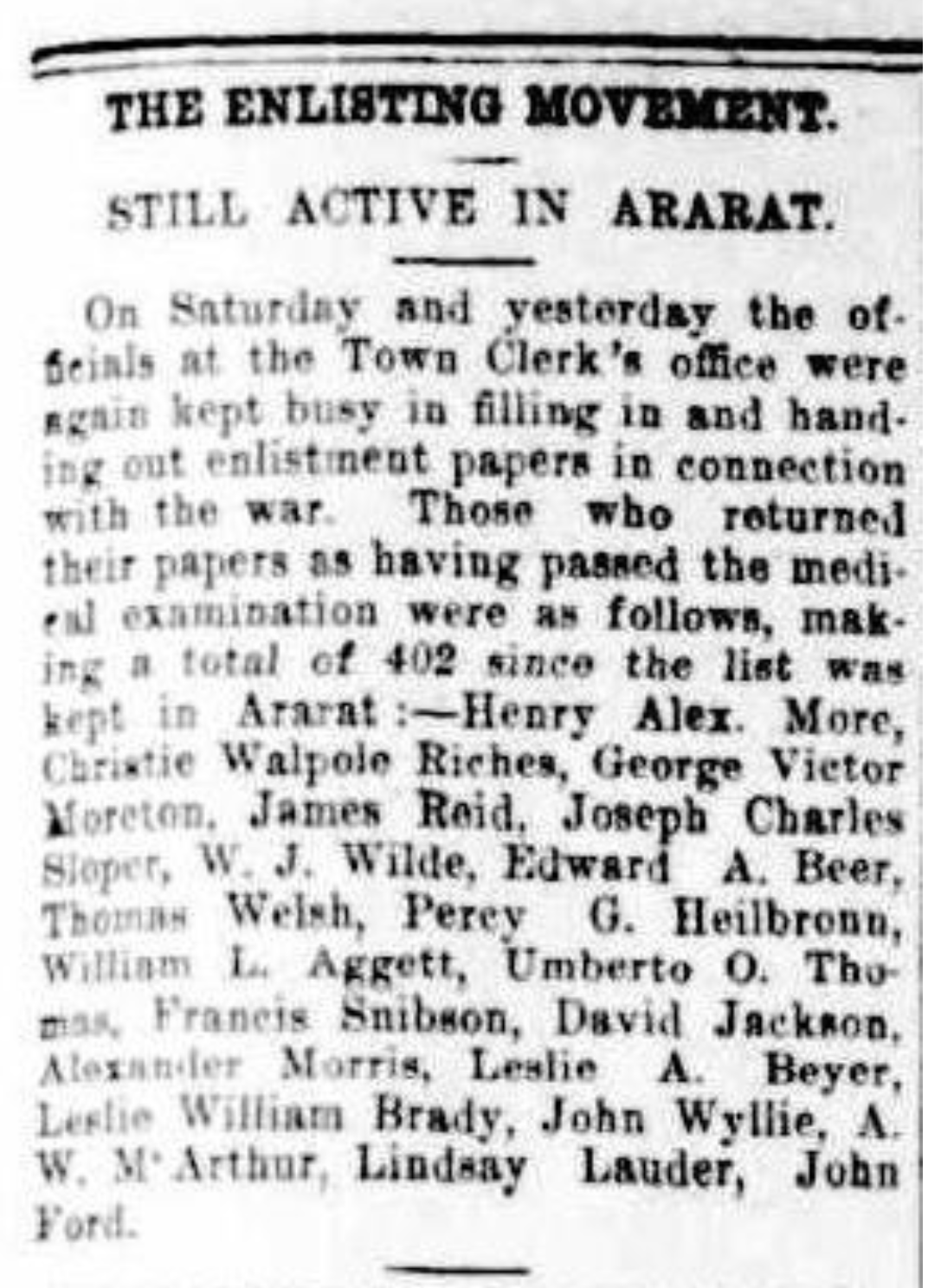 “Ararat Advertiser” (Vic.), Saturday 5 August 1916, page 2 [Trove].