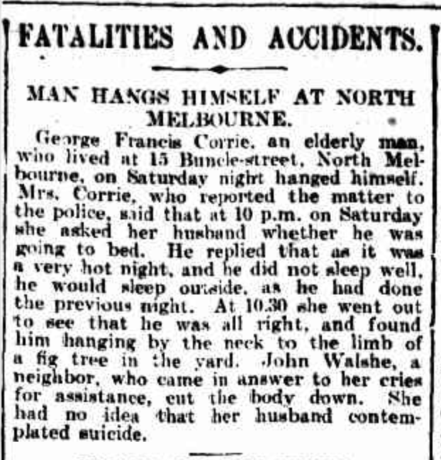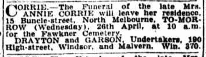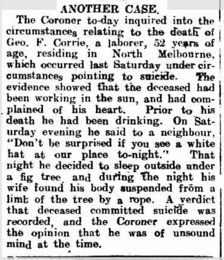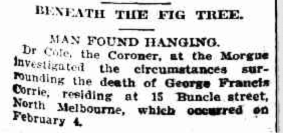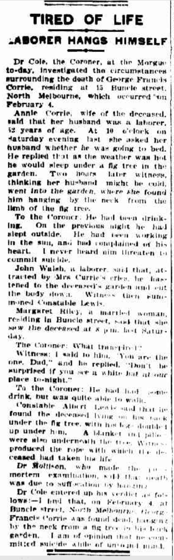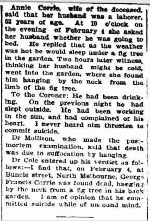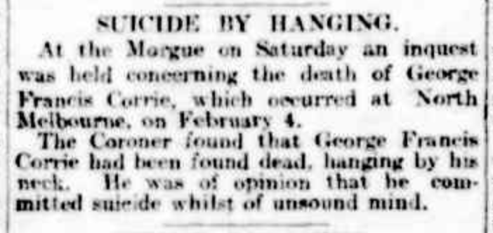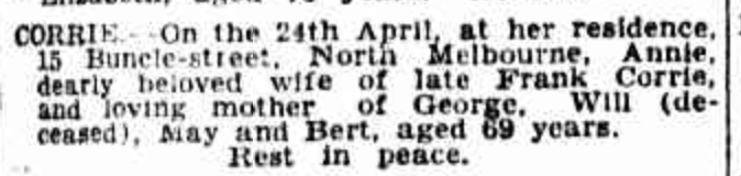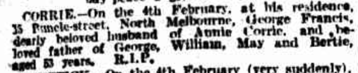 Published References (1.2 CORRIE) “Age” (Melbourne, Vic.), Monday 6 February 1911, page 1 (“Deaths”) [Trove]. “Age” (Melbourne, Vic.), Monday 6 February 1911, page 8 [Trove]. “Bendigo Advertiser” (Vic.), Monday 6 February 1911, page 5 [Trove]. “Bendigo Independent” (Vic.), Monday 6 February 1911, page 5 [Trove]. “Advertiser” (Adelaide, SA), Monday 6 February 1911, page 10 [Trove]. “Herald” (Melbourne, Vic.), Saturday 11 February 1911, page 8 [Trove]. “Argus” (Melbourne, Vic.), Monday 13 February 1911, page 8 [Trove]. “Ballarat Star” (Vic.), Monday 13 February 1911, page 4 [Trove]. “Bendigo Independent” (Vic.), Monday 13 February1911, page 5 [Trove]. “Bendigo Advertiser” (Vic.), Monday 13 February 1911, page 5 [Trove]. “Geelong Advertiser” (Melbourne, Vic.), Monday 13 February 1911, page 3 (extract from article “Tales told at the Morgue”) [Trove]. “Weekly Times” (Melbourne, Vic.), Saturday 18 February 1911, page 33 [Trove]. “Age” (Melbourne, Vic.), 25 April 1933, page 1 (“Deaths”) [Trove]. “Age” (Melbourne, Vic.), Tuesday 25 April 1933, page 1 (“Funeral Notices”) [Trove].