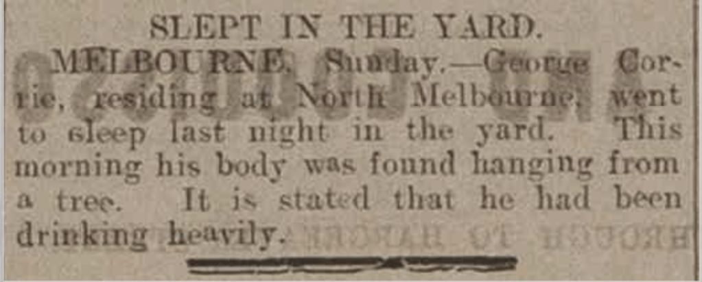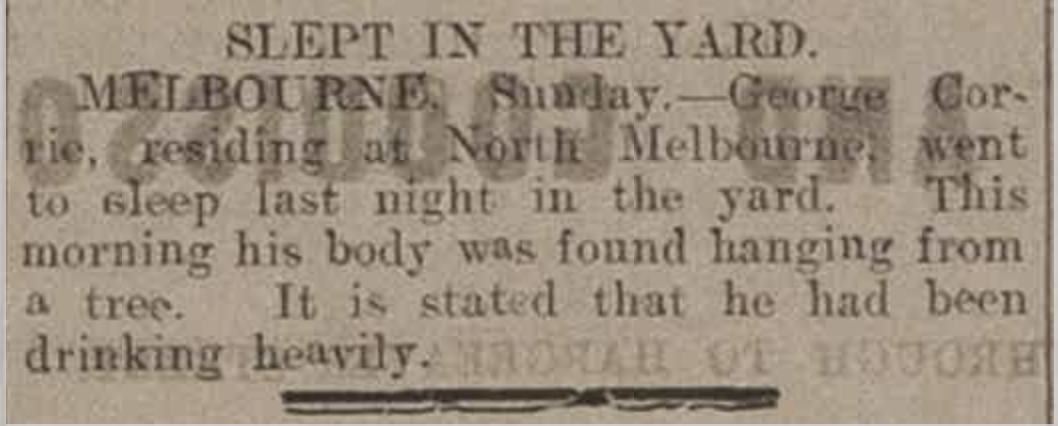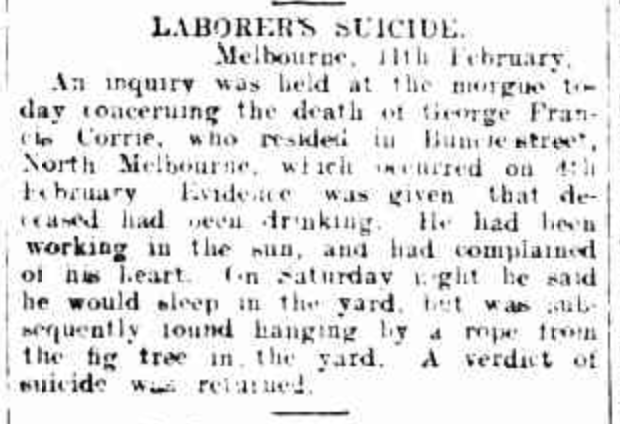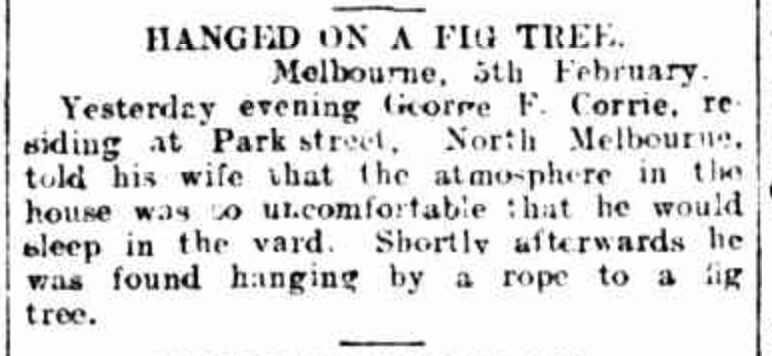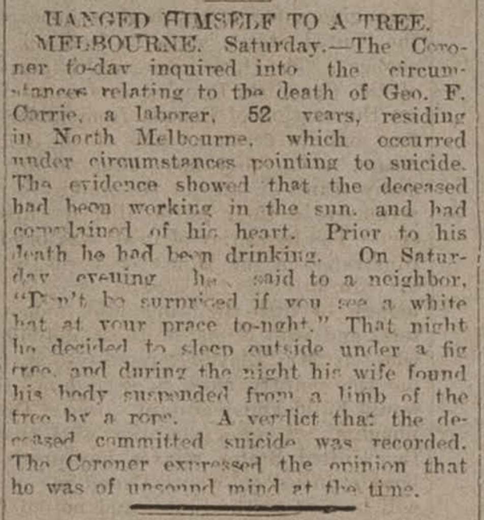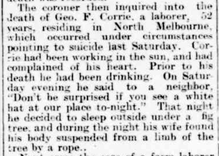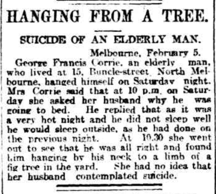 Published References (1.2 CORRIE) “Age” (Melbourne, Vic.), Monday 6 February 1911, page 1 (“Deaths”) [Trove]. “Age” (Melbourne, Vic.), Monday 6 February 1911, page 8 [Trove]. “Bendigo Advertiser” (Vic.), Monday 6 February 1911, page 5 [Trove]. “Bendigo Independent” (Vic.), Monday 6 February 1911, page 5 [Trove]. “Advertiser” (Adelaide, SA), Monday 6 February 1911, page 10 [Trove]. “Herald” (Melbourne, Vic.), Saturday 11 February 1911, page 8 [Trove]. “Argus” (Melbourne, Vic.), Monday 13 February 1911, page 8 [Trove]. “Ballarat Star” (Vic.), Monday 13 February 1911, page 4 [Trove]. “Bendigo Independent” (Vic.), Monday 13 February1911, page 5 [Trove]. “Bendigo Advertiser” (Vic.), Monday 13 February 1911, page 5 [Trove]. “Geelong Advertiser” (Melbourne, Vic.), Monday 13 February 1911, page 3 (extract from article “Tales told at the Morgue”) [Trove]. “Weekly Times” (Melbourne, Vic.), Saturday 18 February 1911, page 33 [Trove]. “Age” (Melbourne, Vic.), 25 April 1933, page 1 (“Deaths”) [Trove]. “Age” (Melbourne, Vic.), Tuesday 25 April 1933, page 1 (“Funeral Notices”) [Trove].