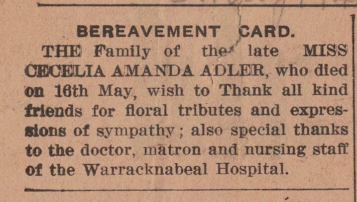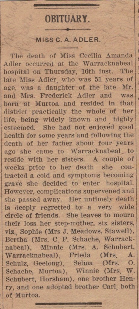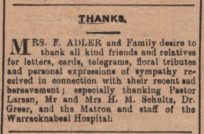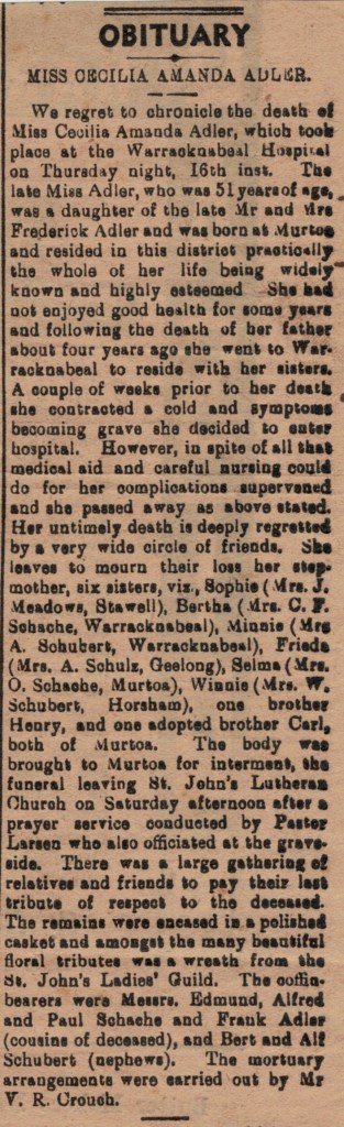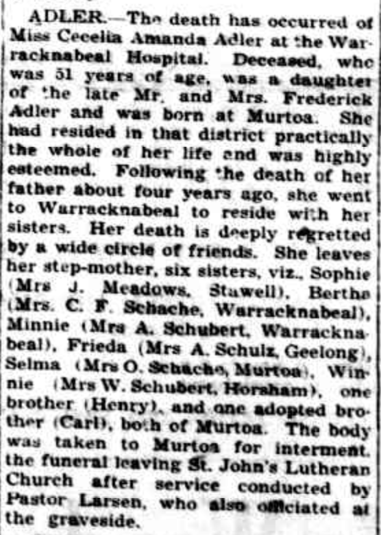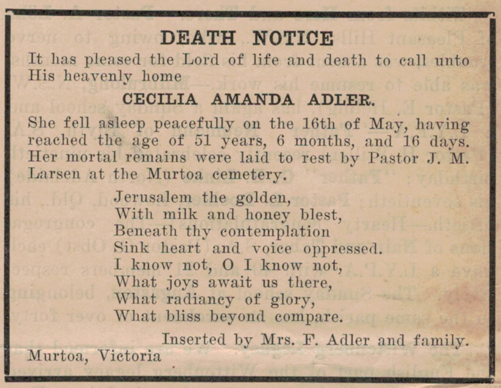 Press References (1.3.8 ADLER) “Dunmunkle Standard and Murtoa Advertiser” (Murtoa, Vic.), May 1940. “Warracknabeal Herald” (Vic.), May, 1940. “Horsham Times” (Vic.) Tuesday 28 May 1940, page 2 (extract from article “Obituary”) [Trove]. “Warracknabeal Herald” (Vic.), c. May, 1940, page 2. “Dunmunkle Standard” (Murtoa,Vic.), c. May 1940 [Tess Hausler (Schache)]. “Lutheran Herald” (Tanunda, SA), 1 July 1940, page 224.