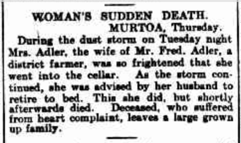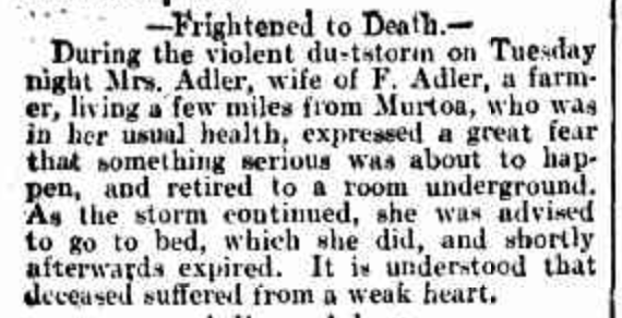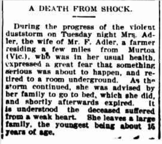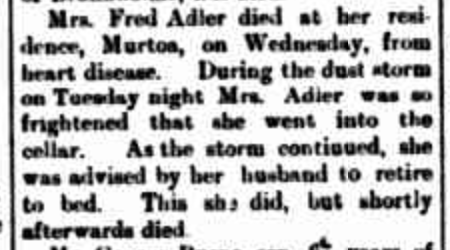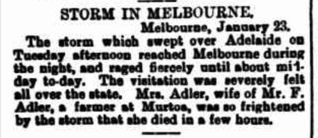“Adelaide Observer (SA), Saturday 1 February 1902, page 28 (extract from “Storm in Victoria”; also published in “Register” (Adelaide SA)), Friday 24 January 1902, page 4 [Trove].