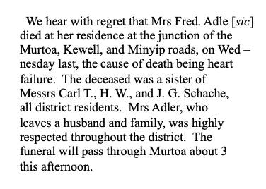“Dunmunkle Standard” (Murtoa Vic.), Friday 31 January 1902, page 2 (extract from “Localisms”) [Tess Hausler (Schache)].
