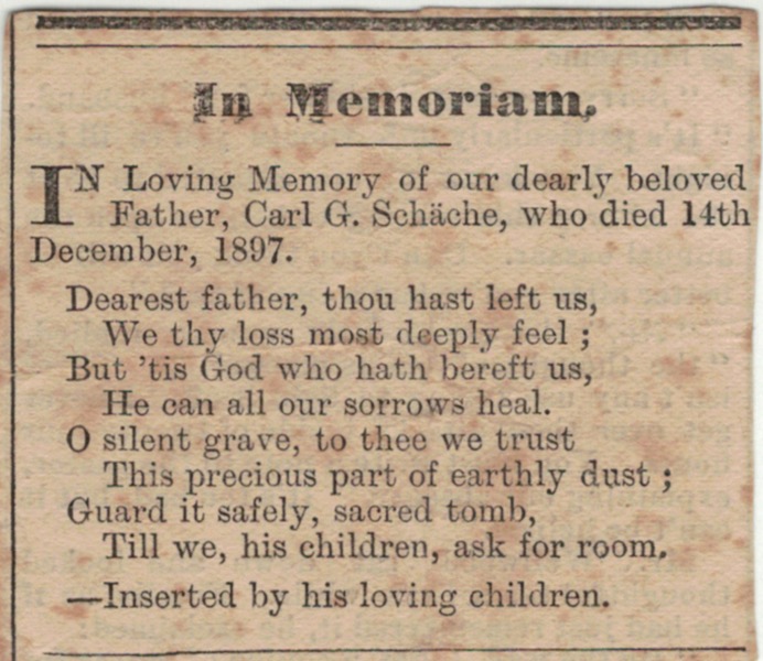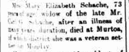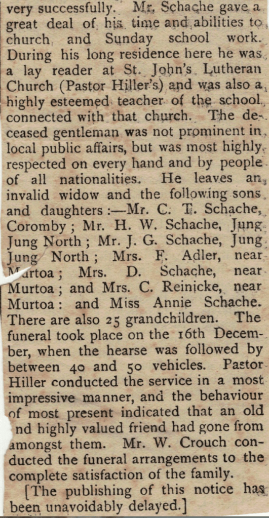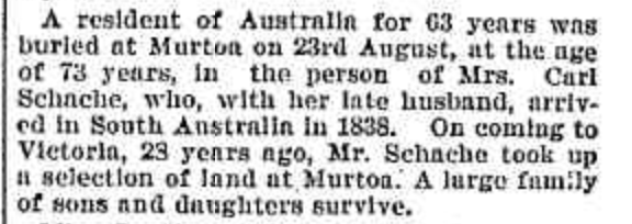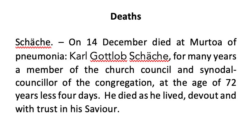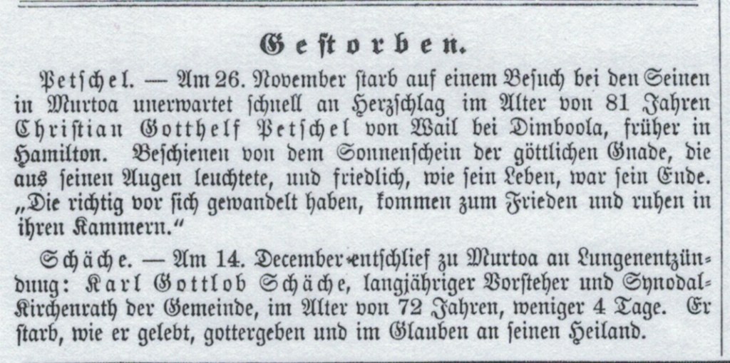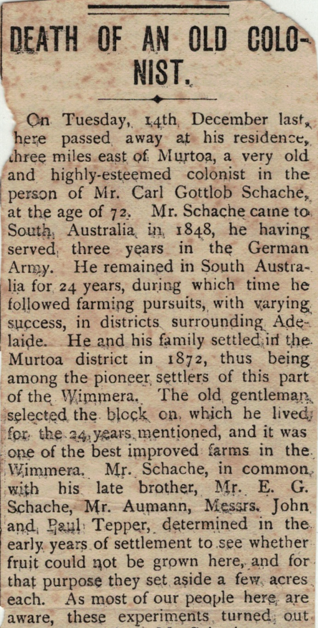Believed to be “Dunmunkle Standard” (Murtoa, Vic.), c. 1898 [Tess Hausler (Schache)].“Australische Christenbote” (Melbourne, Vic.), December 1897, page 190.Translation of the above [Herbert Mees].