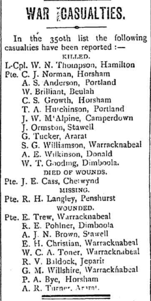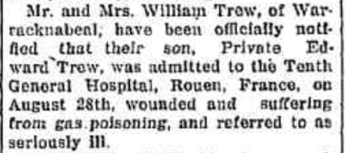 Press References (1.4.4 TREW) “Horsham Times” (Vic.), Friday 2 November 1917, page 5 (extract from article “Warracknabeal”) [Trove]. “Horsham Times” (Vic.), Friday 9 November 1917, page 5 [Trove]. “Dunmunkle Standard” (Murtoa, Vic.), Friday 9 November 1917, page 3 [Trove]. “Warracknabeal Herald” (Vic.), Friday 20 September 1918, page 3 (extract from article “Australia’s Honor Roll/ Killed and Wounded”).