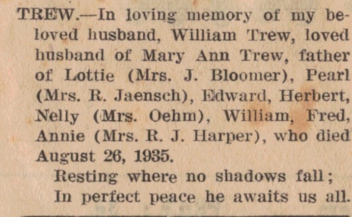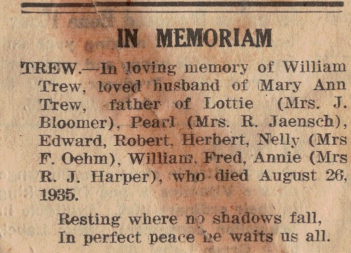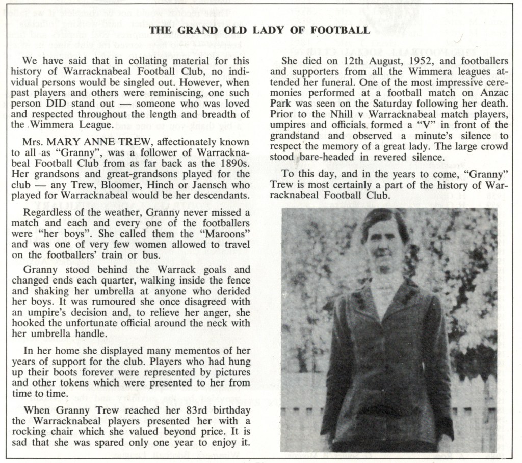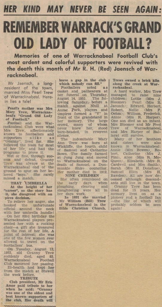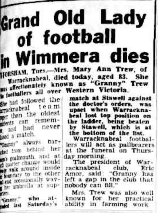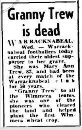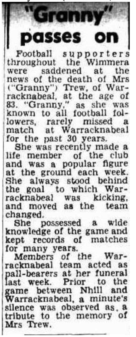 Published References (1.4 BOWN/TREW) “Warracknabeal Herald” (Vic.), Friday 23 August 1946. “Warracknabeal Herald” (Vic.) Tuesday 26 August 1947 (“In Memoriam”). “Sun News-Pictorial” (Melbourne, Vic.), Wednesday 13 August 1952, page 27 [Trove]. “Sun News-Pictorial” (Melbourne, Vic.), Thursday 14 August 1952, page 3 [Trove]. “Weekly Times” (Melbourne, Vic.), Wednesday 20 August 1952, page 62 [Trove]. “Warracknabeal Herald” (Vic.), Tuesday 31 October 1967 [JAS]. “Centenary Warracknabeal Football Club 1886-1986” (ed. John Brennan), page 79 [JAS].