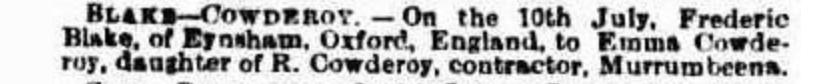 Press References (1.4 COWDEROY/BLAKE) “Age” (Melbourne, Vic.), Saturday 26 July 1890, page 5 [Trove]. “Sydney Morning Herald” (NSW), Tuesday 10 October 1911, page 10 [Trove].