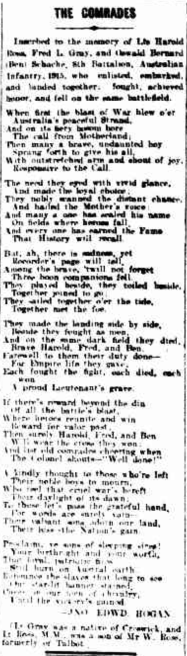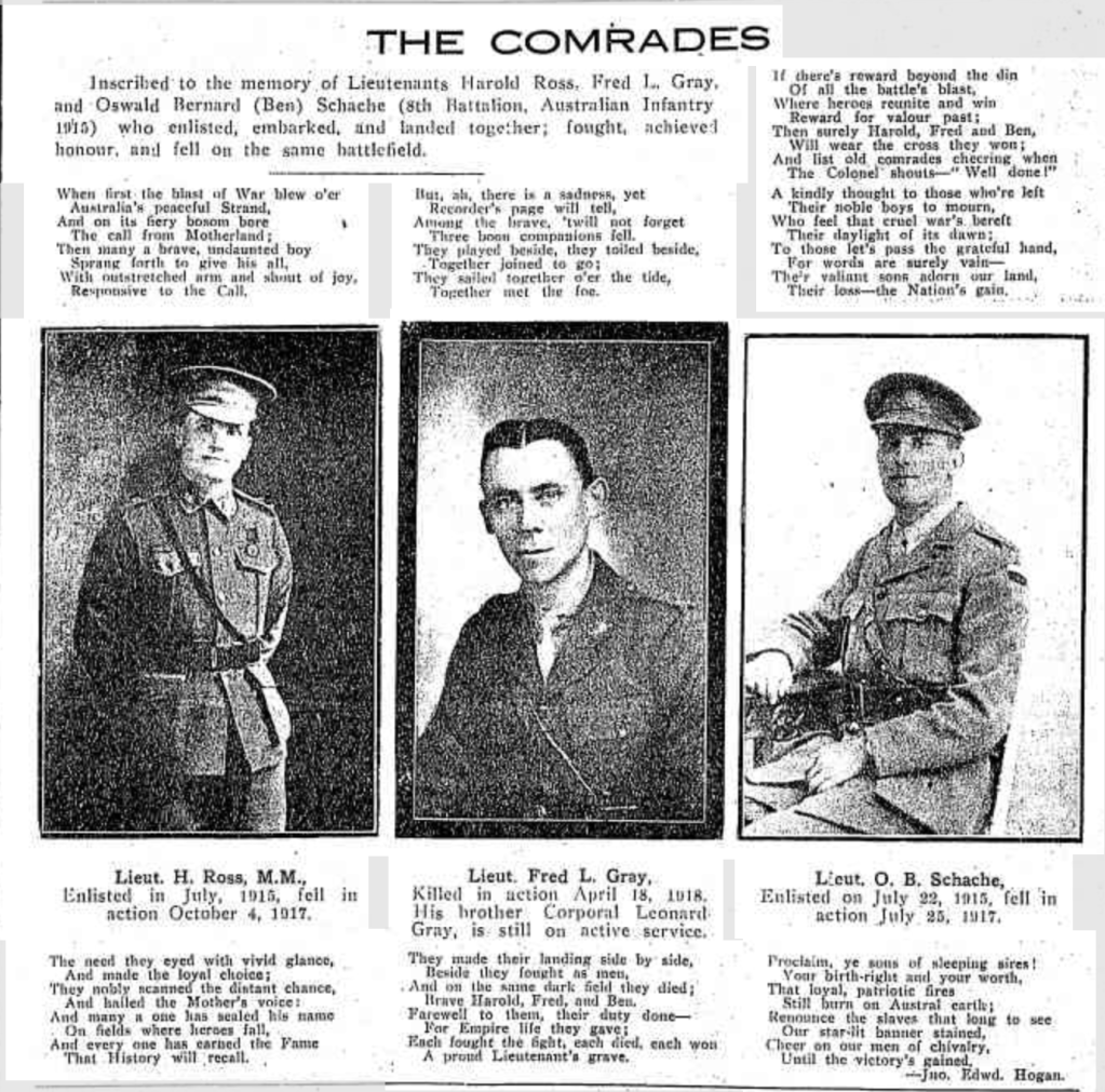 Press References (1.5.8.2 SCHACHE) “Ballarat Courier” (Vic.), Monday 6 August 1917, page 3 [Trove]. “Rainbow Argus” (Vic.), Friday 10 August 1917, page 2 (extract from article “Obituary”) [Trove]. “Dunmunkle Standard” (Murtoa, Vic.), Friday 10 August 1917, page 3. “Argus” (Melbourne, Vic.), Tuesday 14 August 1917, page 1 (“Died on Service”) [Trove]. “Warracknabeal Herald” (Vic.), Tuesday 14 August 1917, page 4 (Trove]. “Dunmunkle Standard” (Murtoa, Vic.), Friday 28 September 1917, page 3 [Trove]. “Horsham Times” (Vic.) Tuesday 2 October 1917, page 3 (extract from article “About People”) [Trove]. “Ballarat Courier” (Vic.), Wednesday 22 May 1918, page 4 [Trove]. “Graphic of Australia” (Melbourne, Vic.), Friday 28 June 1918, page 14 [Trove]. “Murtoa and District Advertiser”, 15 June 2017, page 7.