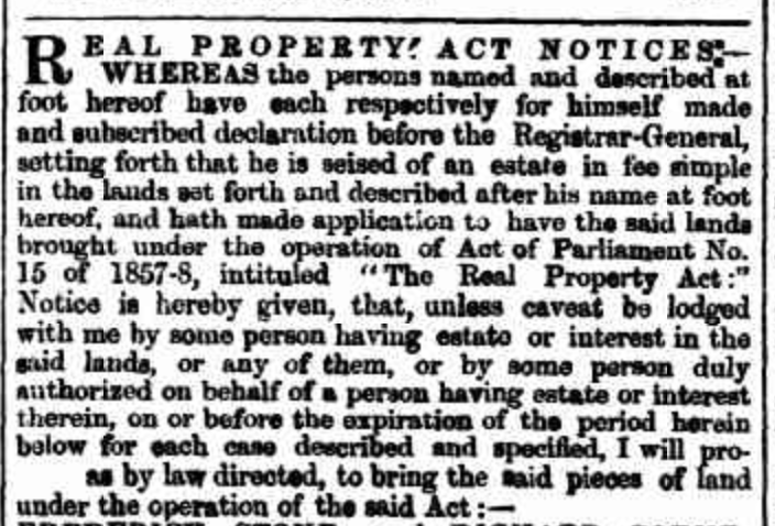 “South Australian Advertiser” (Adelaide, SA), Friday 18 February 1859, page 1 (extract from article “Public Notices”) [Trove].
