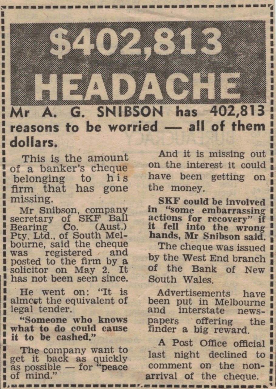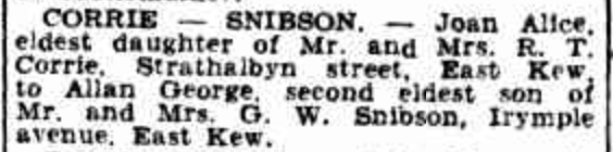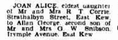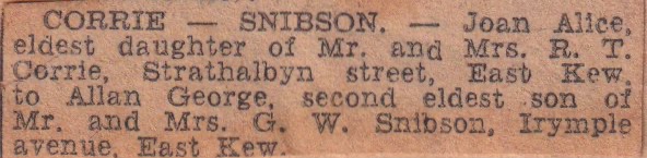 Press References (1.6.1.2 SNIBSON) “Argus” (Melbourne, Vic.), Monday 10 February 1947, page 8 (extract from article “Engagements Announced”) [Trove]. Source unknown, engagement notice 1947. “Herald” (Melbourne, Vic.), Monday 24 February 1947, page 10 (extract from article “Engagements Announced”) [Trove]. “Sun” (Melbourne, Vic.), Tuesday 30 May 1972. Possibly “Age” (Melbourne, Vic.) May 1972. Possibly “Sun” (Melbourne, Vic.) May 1972.