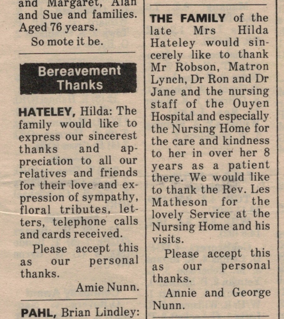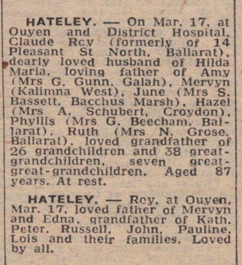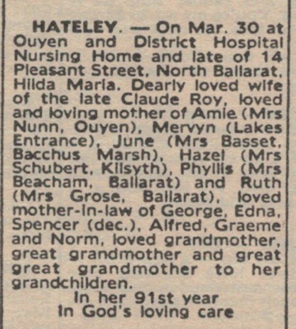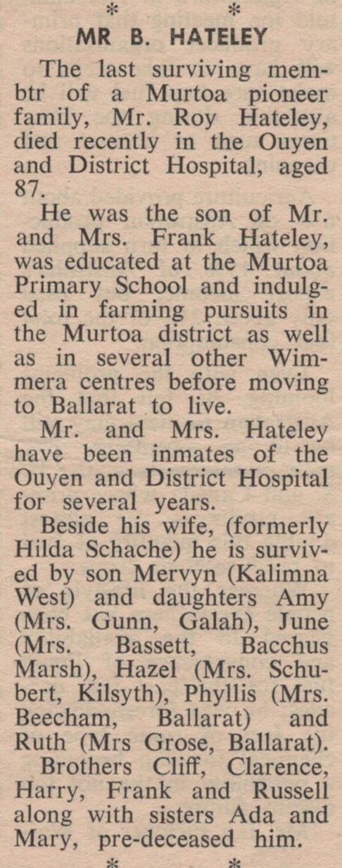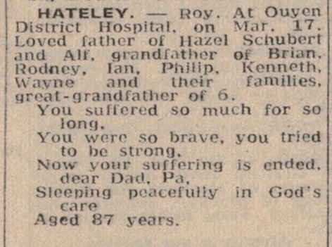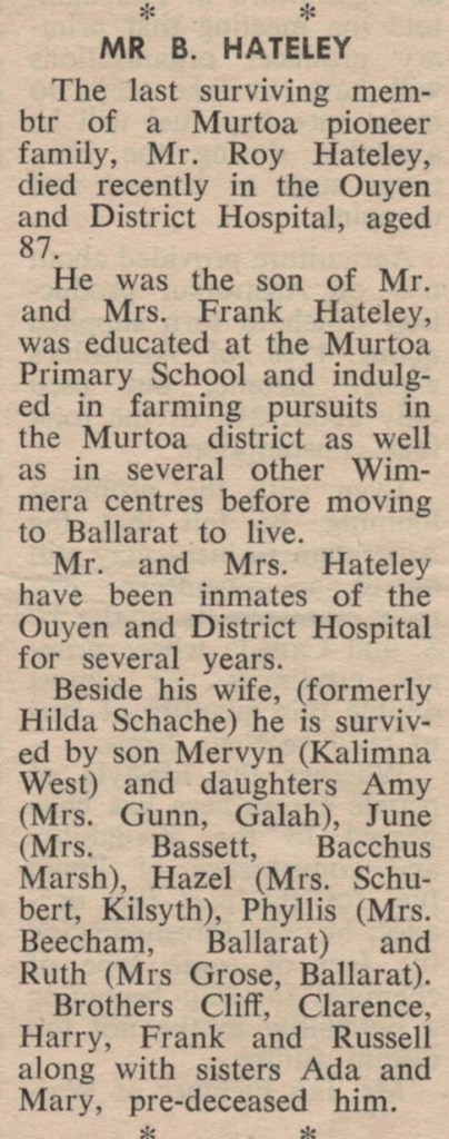 “Murtoa and District Advertiser” (Vic.), Wednesday 15 May 1985, page 4 (extract from article “District Obituary”) [JAS].