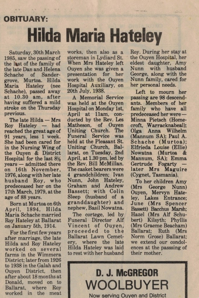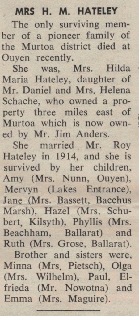 “Murtoa and District Advertiser” (Vic.), Wednesday 1 August 1979, page 2 (extract from article “District Obituary”) which also included obituaries of Dora Schache and Emmie Maguire (Schache) [JAS].