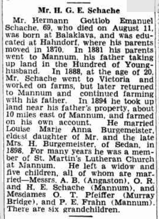 Press References (1.7.8 SCHACHE) “Chronicle” (Adelaide, SA), Thursday 30 September 1937, page 46 (extract from article “Obituary”) [Trove].