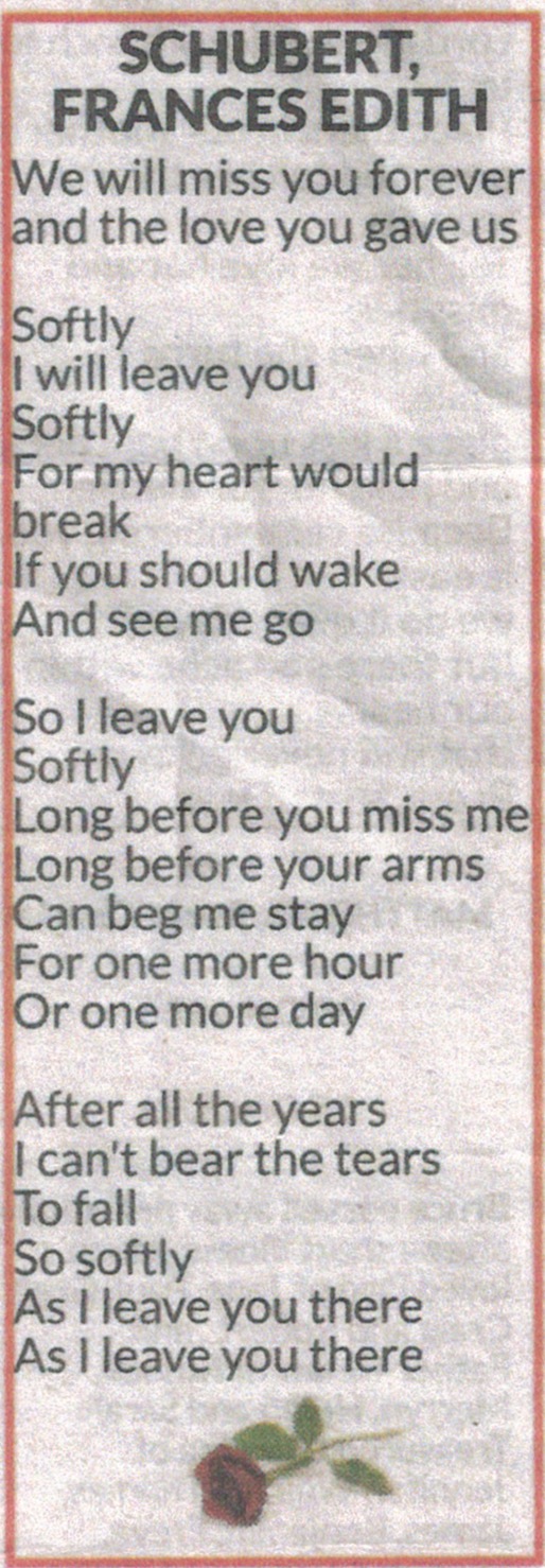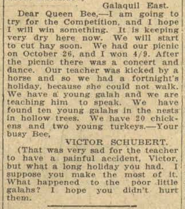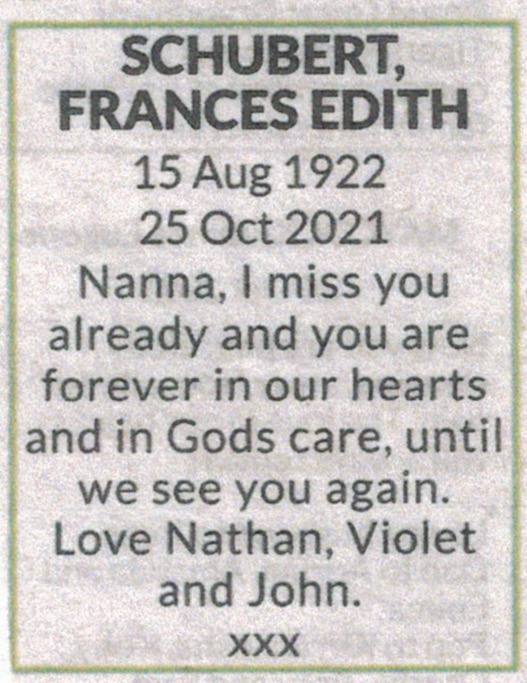 Press References (1.8.6.1 SCHUBERT) Children’s Corner, Farmers’ Advocate (Melbourne, Vic.), Friday December 7 1923, page 16 [Trove]. “Herald Sun” (Melbourne, Vic., Wednesday 27 October 2021. “Herald Sun” (Melbourne, Vic.), Thursday 28 October 2021. “Herald Sun” (Melbourne, Vic.), Monday 28 October 2021.