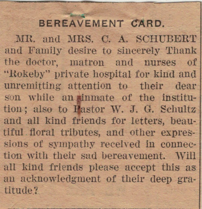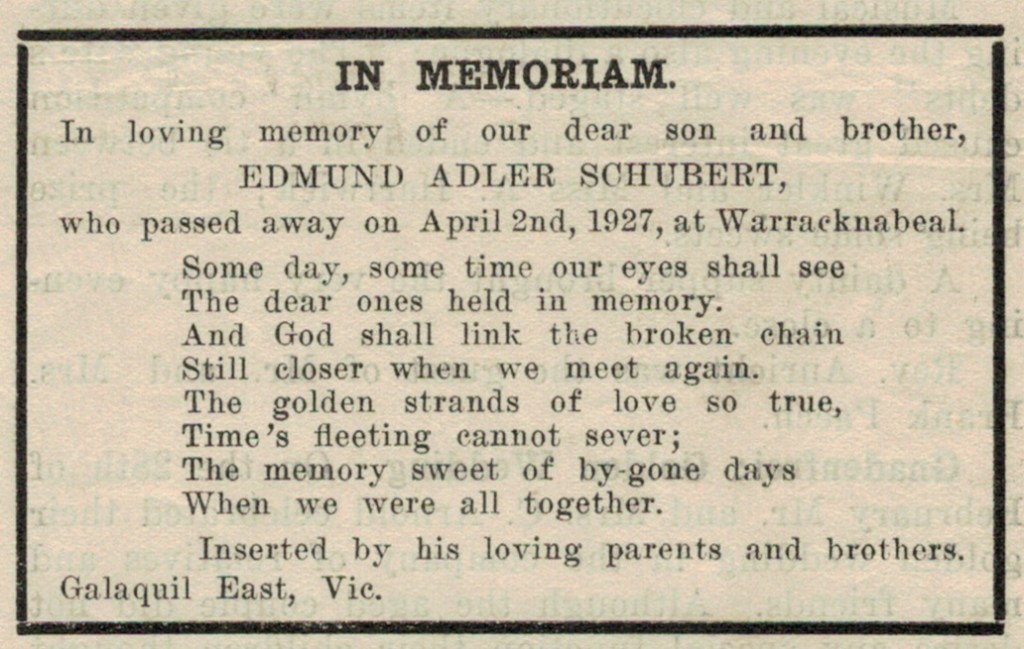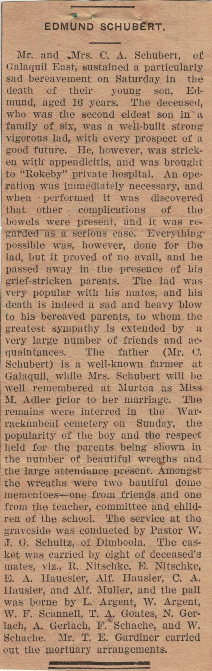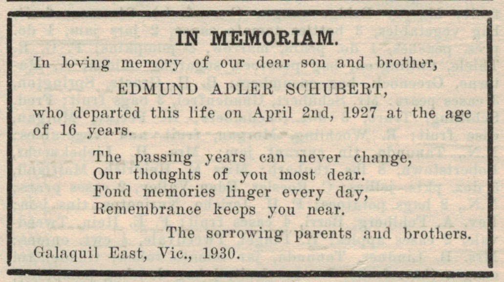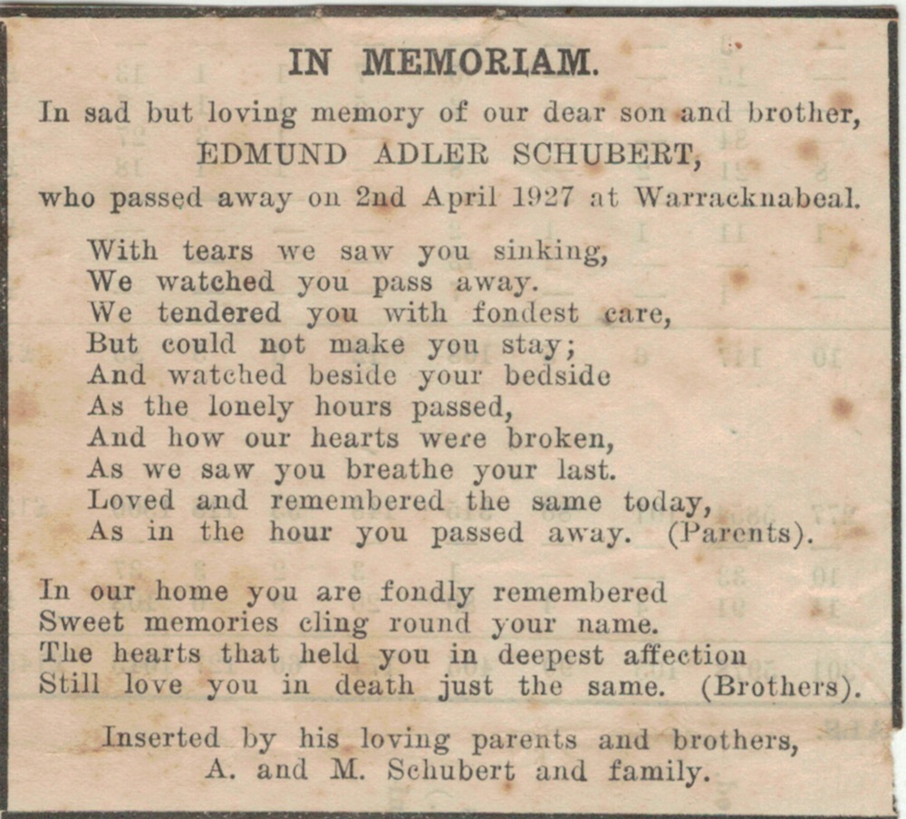 Press References (1.8.6.2 SCHUBERT) Warracknabeal Herald (Vic.), April 1927. Warracknabeal Herald (Vic.), April 1927. Lutheran Herald (Tanunda, SA), probably April 1928. Lutheran Herald (Tanunda, SA), 1 April, 1929, page 112. “Lutheran Herald” (Tanunda, SA), 14 April 1930, page 128.