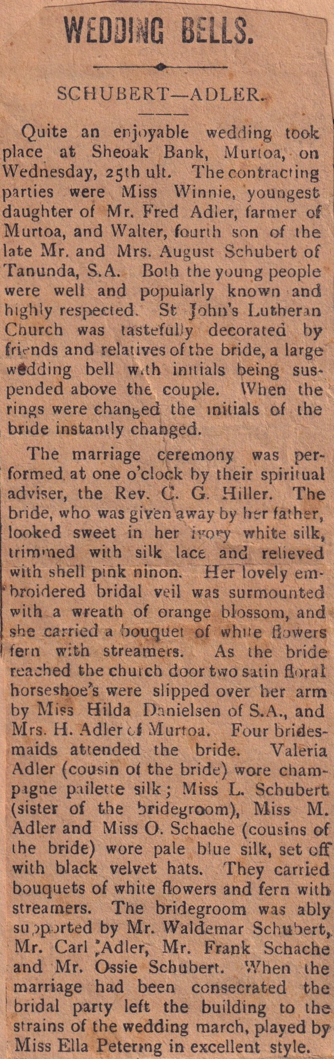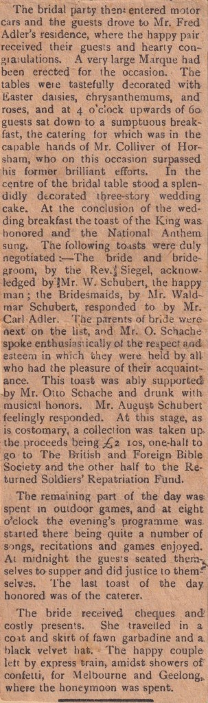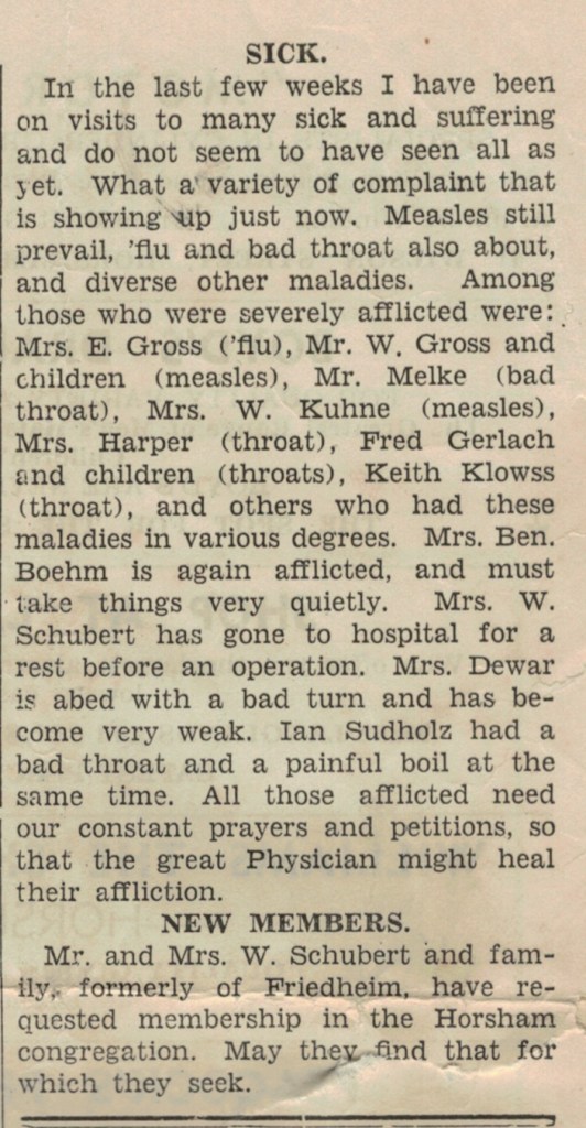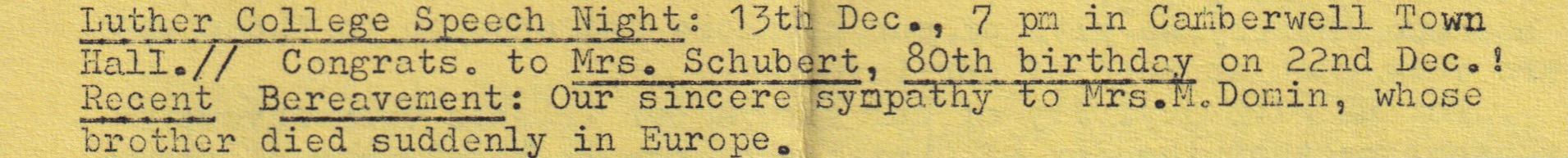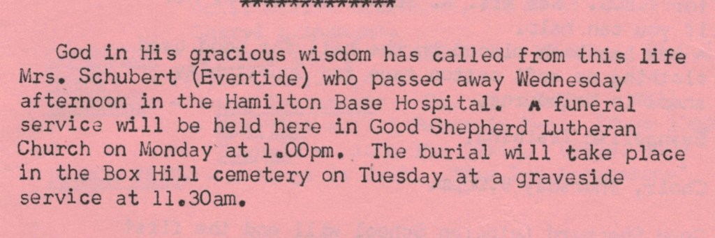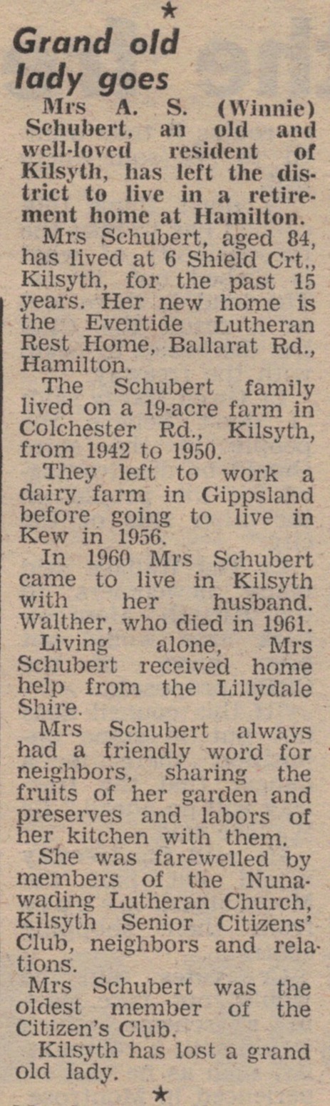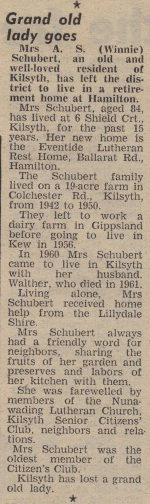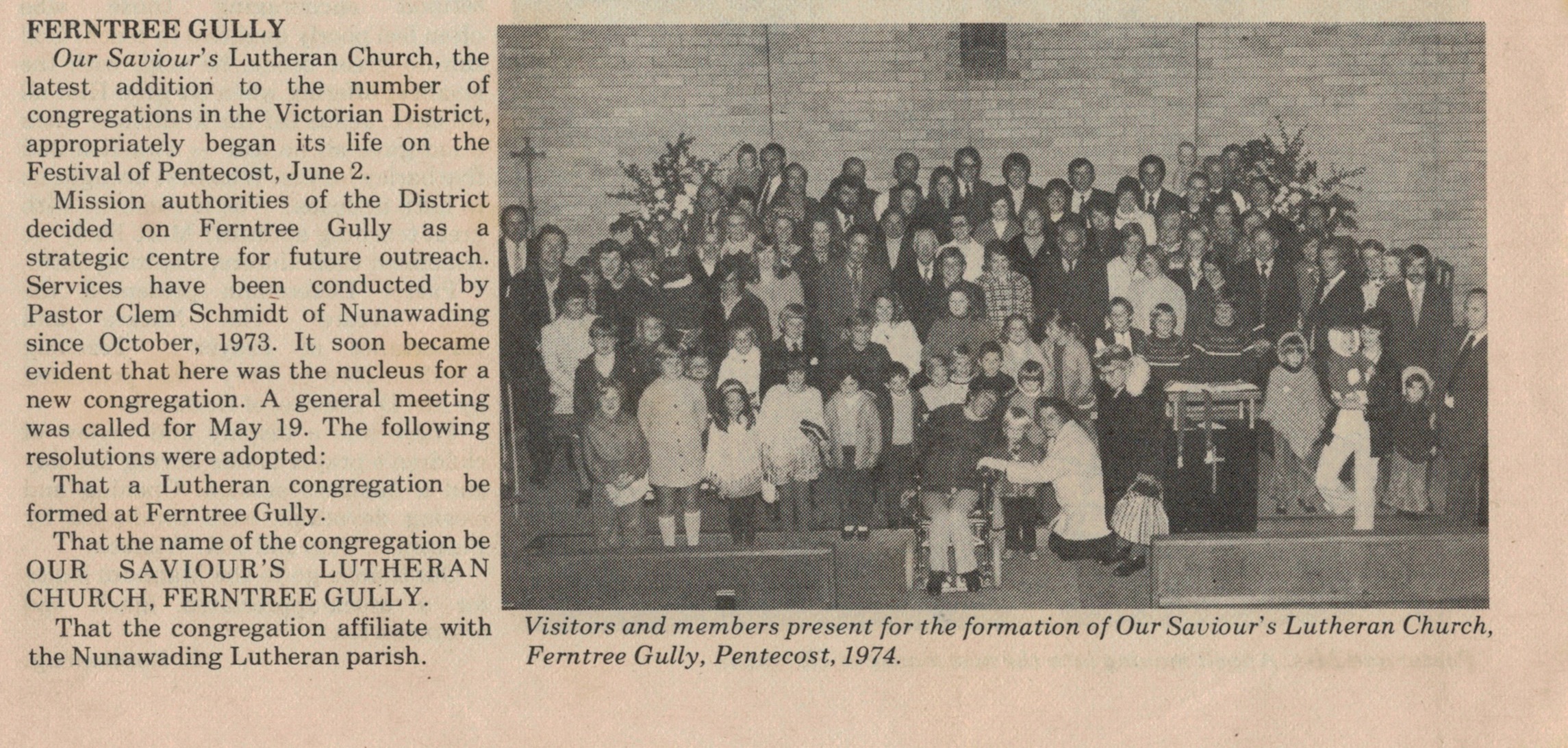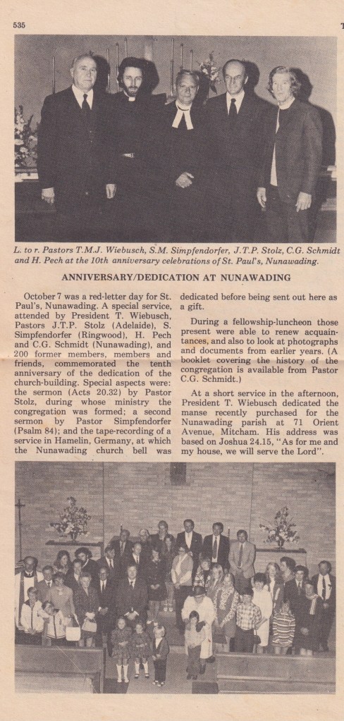 “Lutheran” (Adelaide, SA), 3 December 1973, page 15. The caption on the lower photograph: The congregation at the fIrst Lutheran service at Ferntree Gully, October 14, in the Anglican church of St. Thomas. Winnie Schubert (Adler) standing at front.