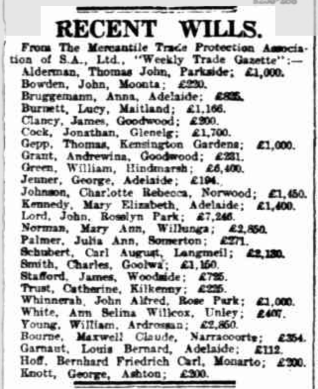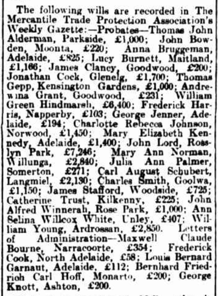 “Mail” (Adelaide, SA), Saturday 16 September 1916, page 3; also in “Saturday Mail” (Adelaide, SA), same date, page 1. Note: the reference to the will of August Schubert (Bernard Hoff’s brother-in-law).“Mail” (Adelaide, SA), Saturday 16 September 1916, page 3; also in “Saturday Mail” (Adelaide, SA), same date, page 1. Note: the reference to the will of August Schubert (Bernard Hoff’s brother-in-law).