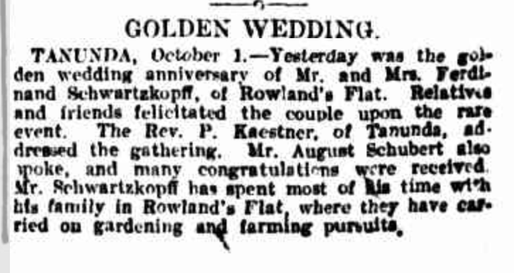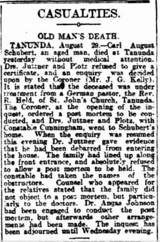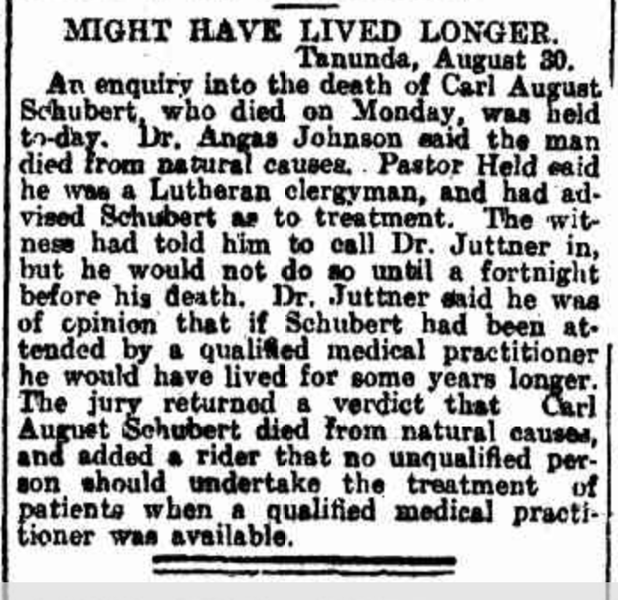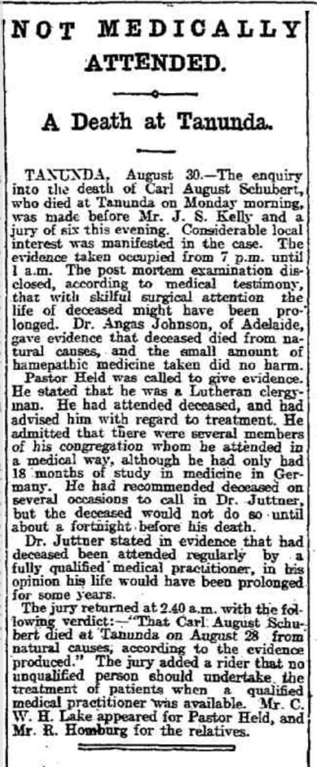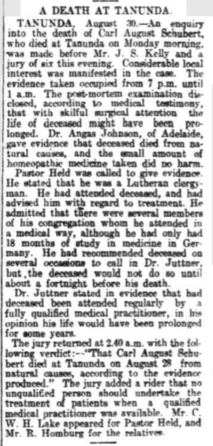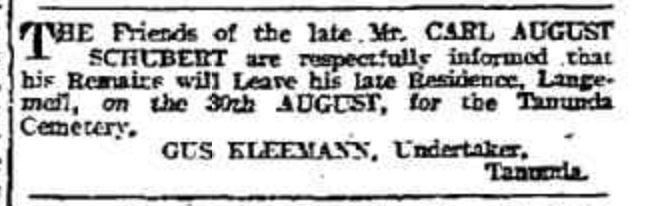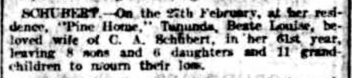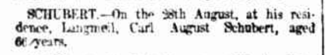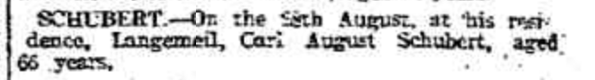 “Observer” (Adelaide, SA), Saturday 23 September 1916, page 30 (“Personal”); also in “Journal” (Adelaide, SA), Saturday 16 September 1916, page 24; “Advertiser” (Adelaide, SA), Monday 18 September 1916, page 6; “Daily Herald” (Adelaide, SA), Monday 18 September 1916, page 14; “Chronicle” (Adelaide, SA), Saturday 23 September 1916, page 35. Note: the reference to the will of Bernhard Hoff (August Schubert’s brother-in-law).