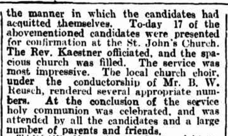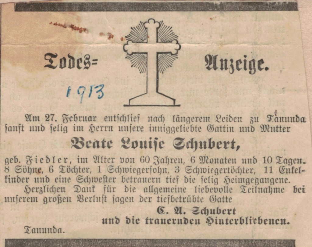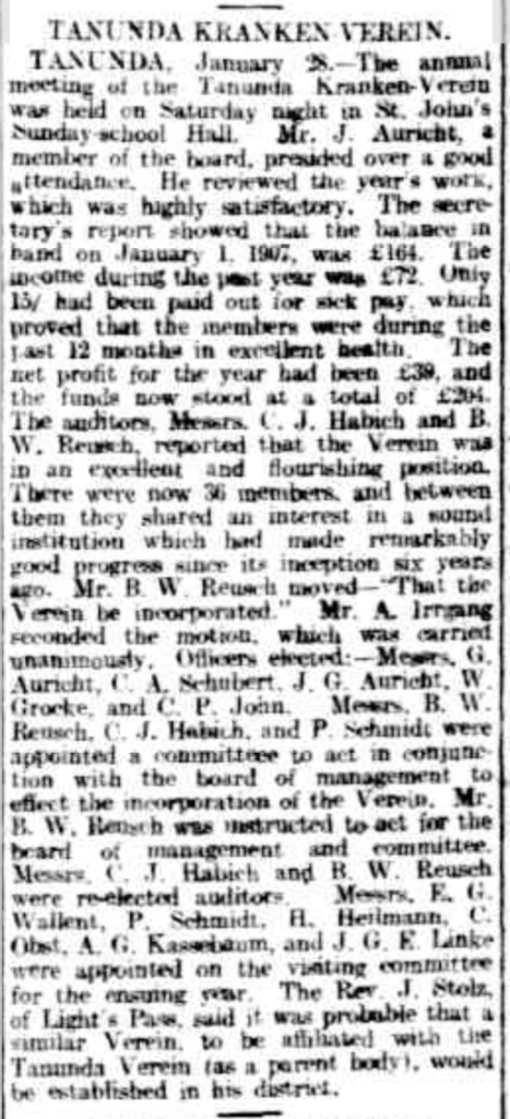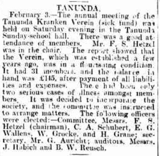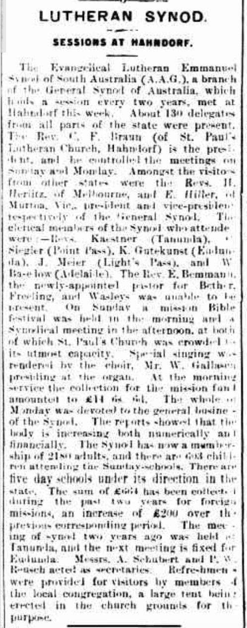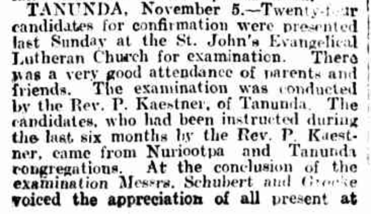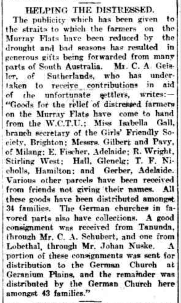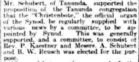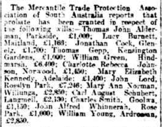 “Observer” (Adelaide, SA), Saturday 23 September 1916, page 30 (“Personal”); also in “Journal” (Adelaide, SA), Saturday 16 September 1916, page 24; “Advertiser” (Adelaide, SA), Monday 18 September 1916, page 6; “Daily Herald” (Adelaide, SA), Monday 18 September 1916, page 14; “Chronicle” (Adelaide, SA), Saturday 23 September 1916, page 35. Note: the reference to the will of Bernhard Hoff (August Schubert’s brother-in-law).