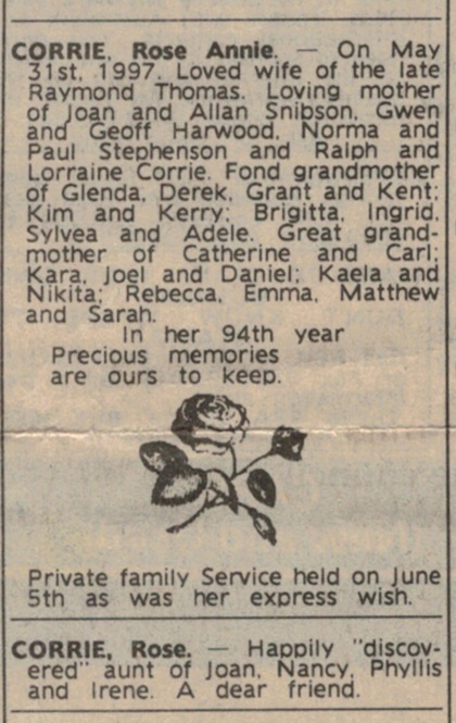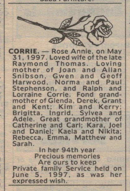 “Age” (Melbourne, Vic.), Friday 6 June 1997 [“Deaths”).