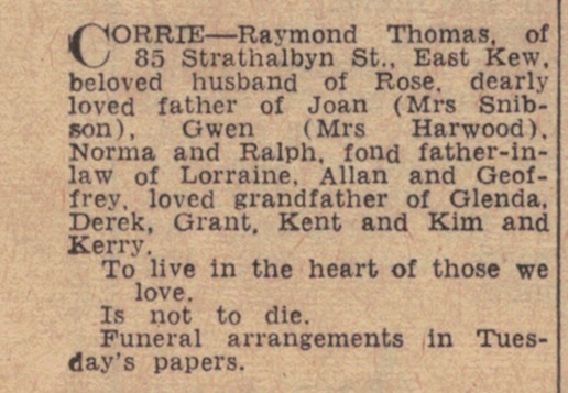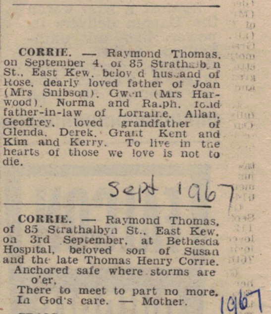 “Herald” (Melbourne, Vic.), Monday 4 September 1967, page 4 (“Deaths”).