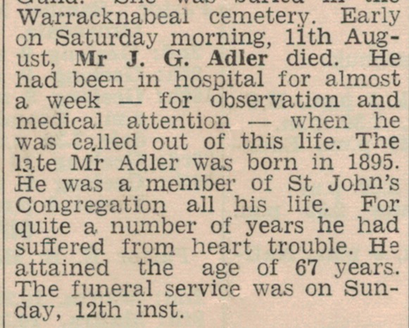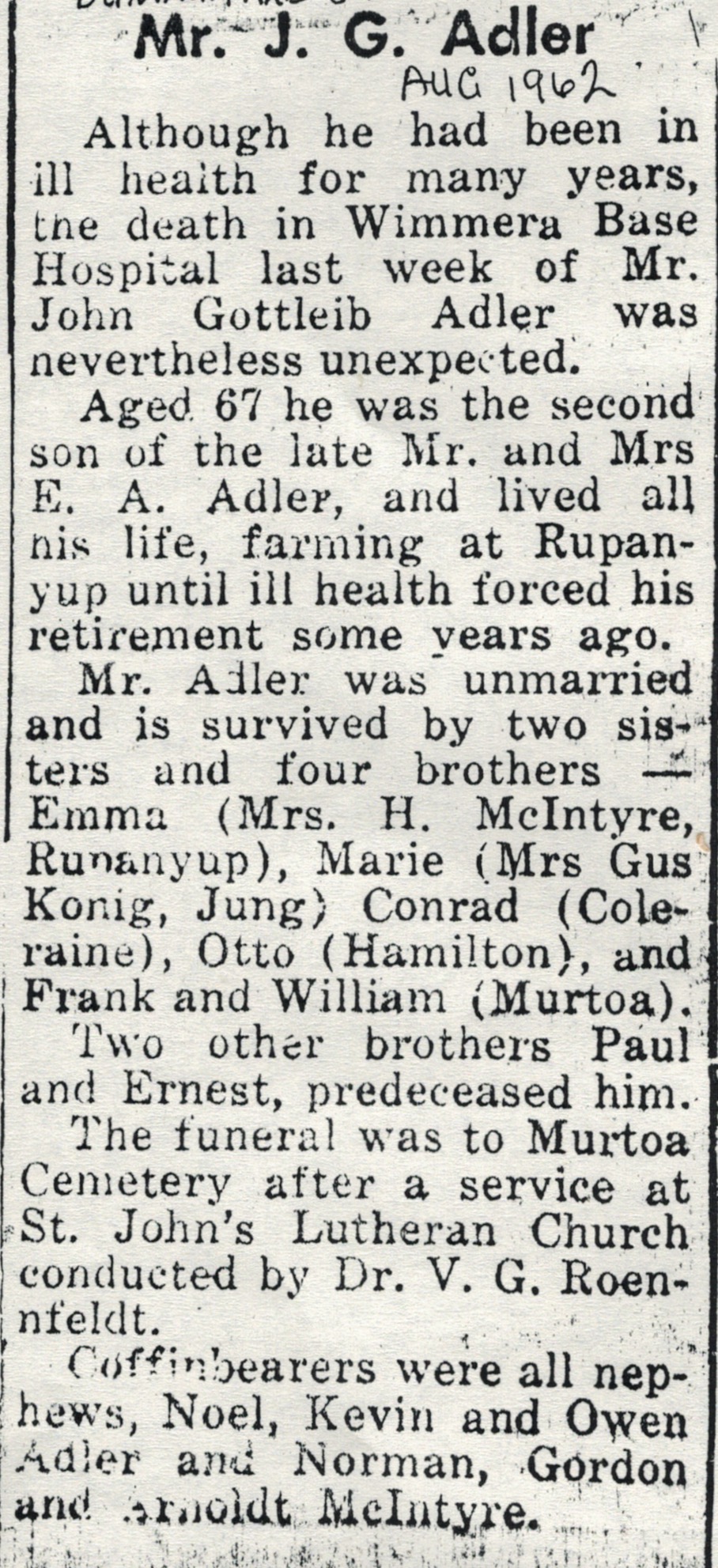 Press References (1.9.4 ADLER) “Dunmunkle Standard” (Murtoa, Vic.), August 1962.j “Lutheran News” (Horsham, Vic.), September 1962, page 7 (extract from “Obituaries”).