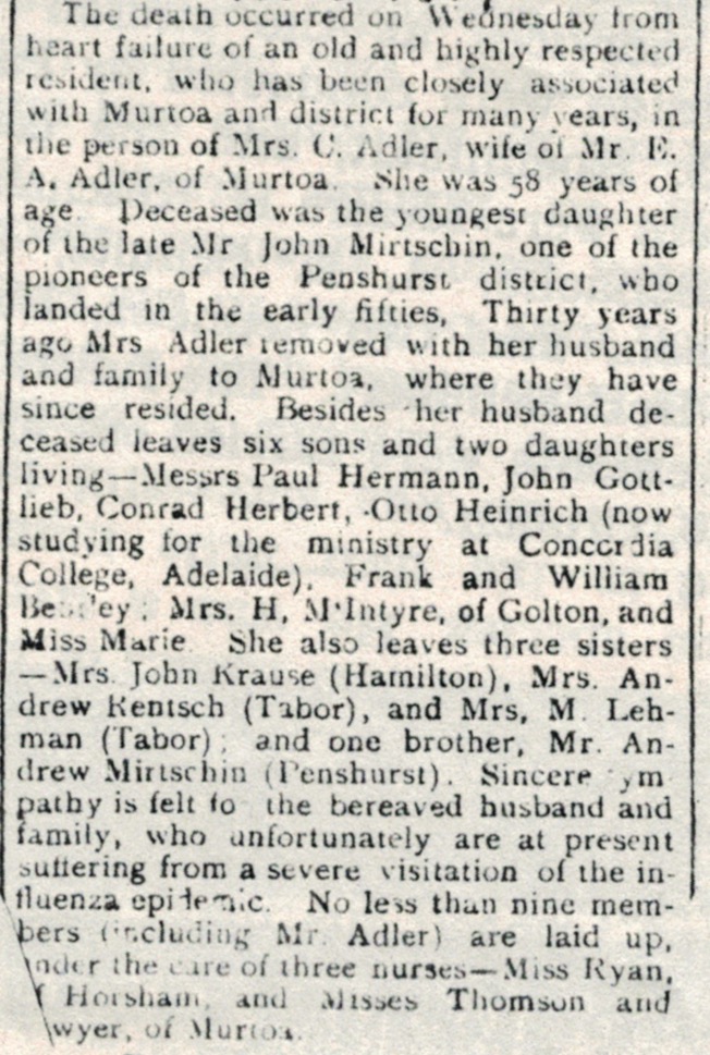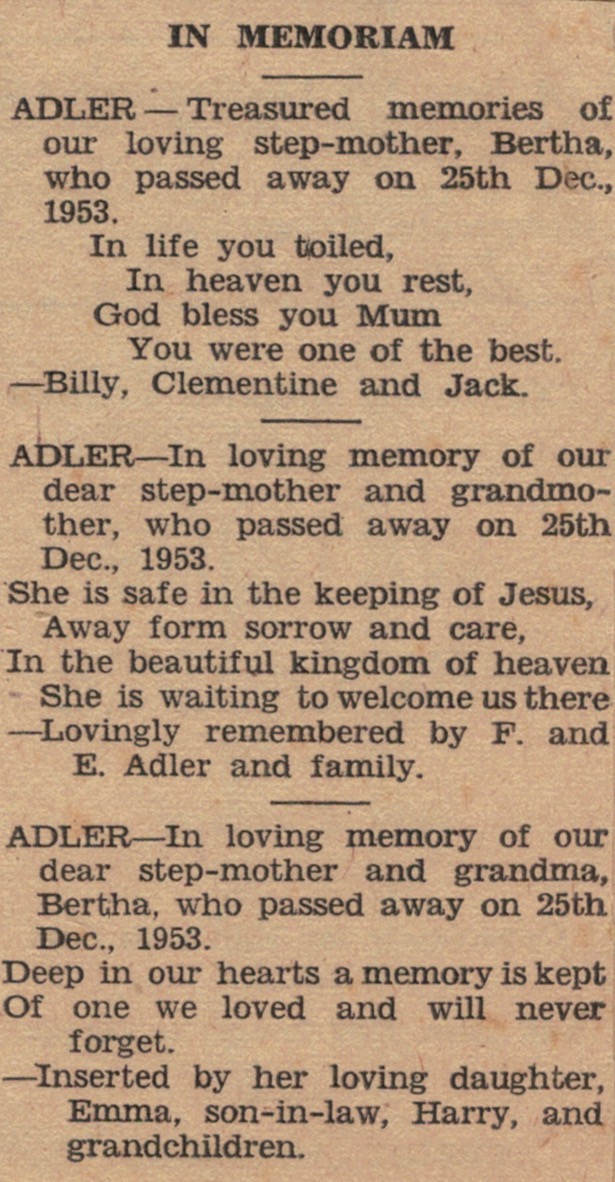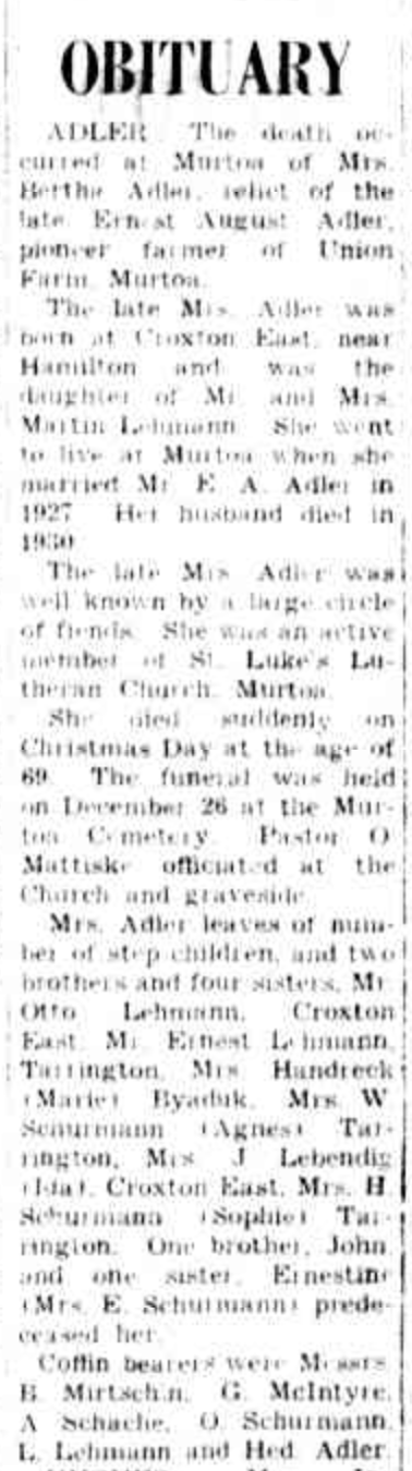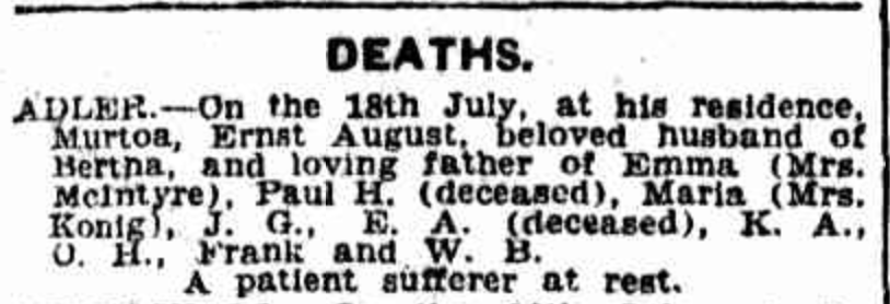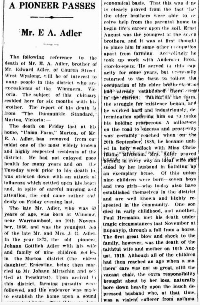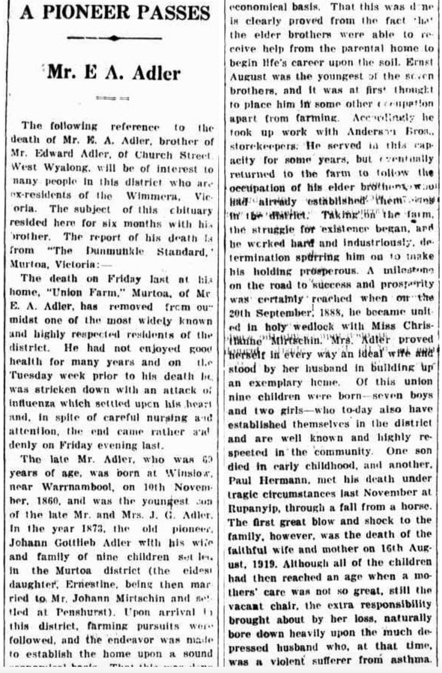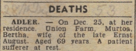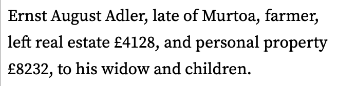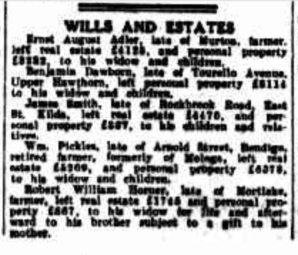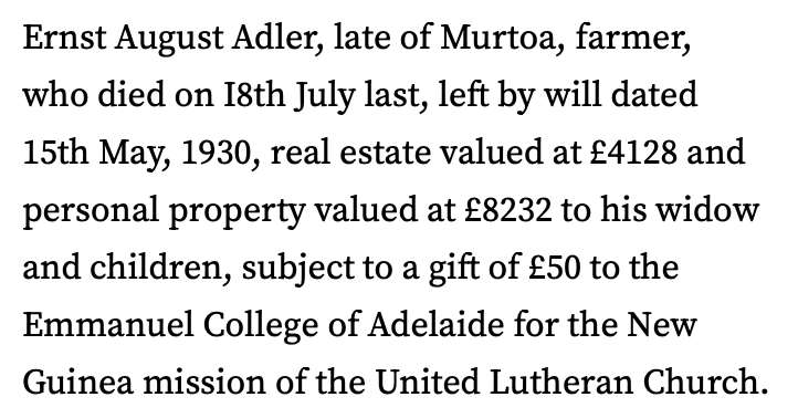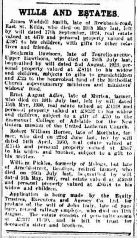 “Dunmunkle Standard and Murtoa Advertiser” (Murtoa, Vic.) Tuesday, 12 August 1919.“Age” (Melbourne, Vic.), Tuesday 22 July 1930, page 1 [Trove]. An identical notice was published in “Argus” (Melbourne, Vic.), same date, page 1.