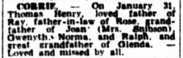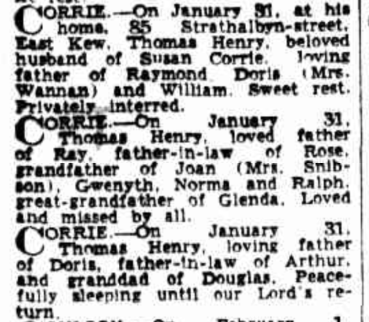 Published References (1.9 CORRIE) “Age” (Melbourne, Vic.), Saturday 2 February 1952, page 2 (“Deaths”). “Argus” (Melbourne, Vic.), Saturday 2 February 1952, page 17 (“Deaths”). “Greater Eastern Suburbs Standard” (Vic.).