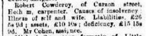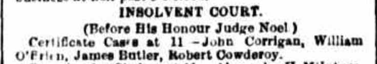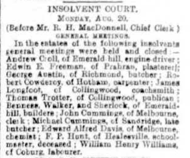 “Herald” (Melbourne, Vic.), Tuesday 14 August 1877, page 3 (extract from article “New Insolvents”); also published in “Argus” (Melbourne, Vic), 15 August 1877, page 5 (extract from article “New Insolvents”) [Trove].