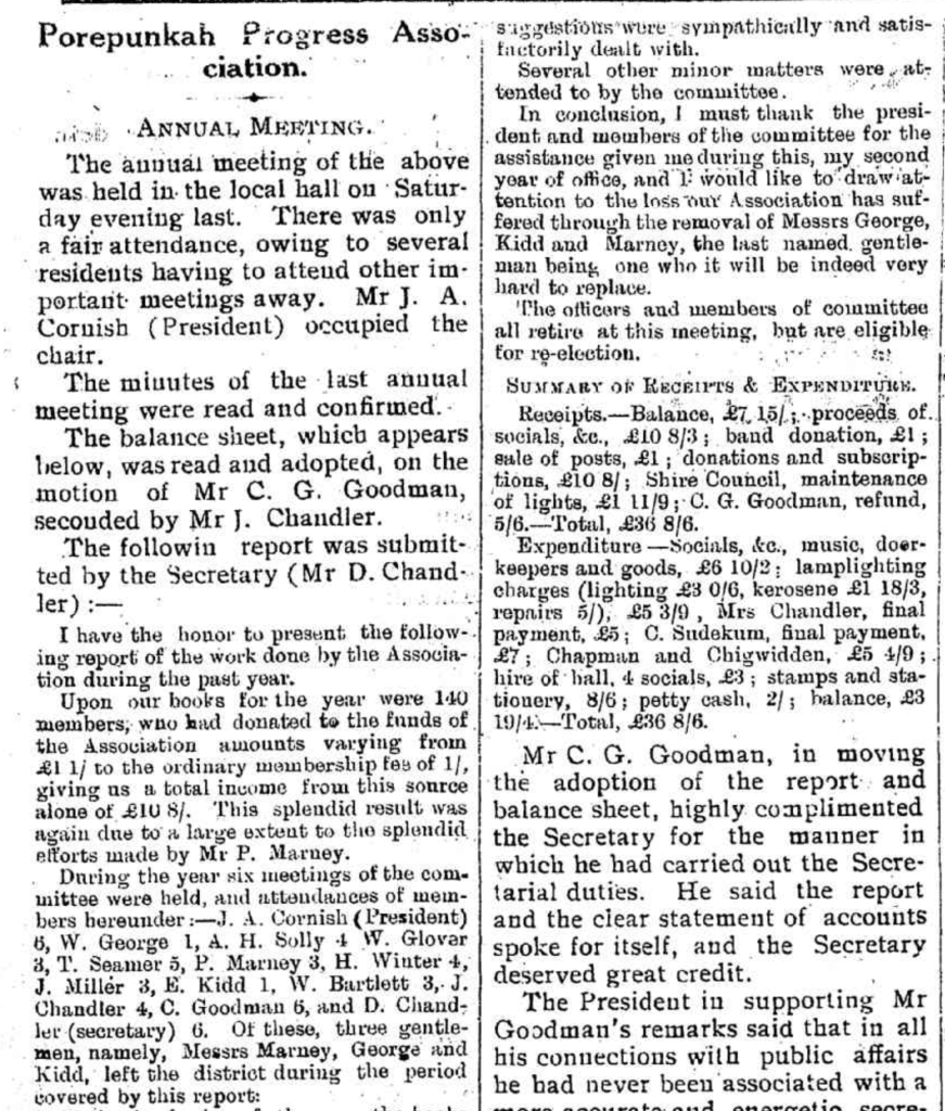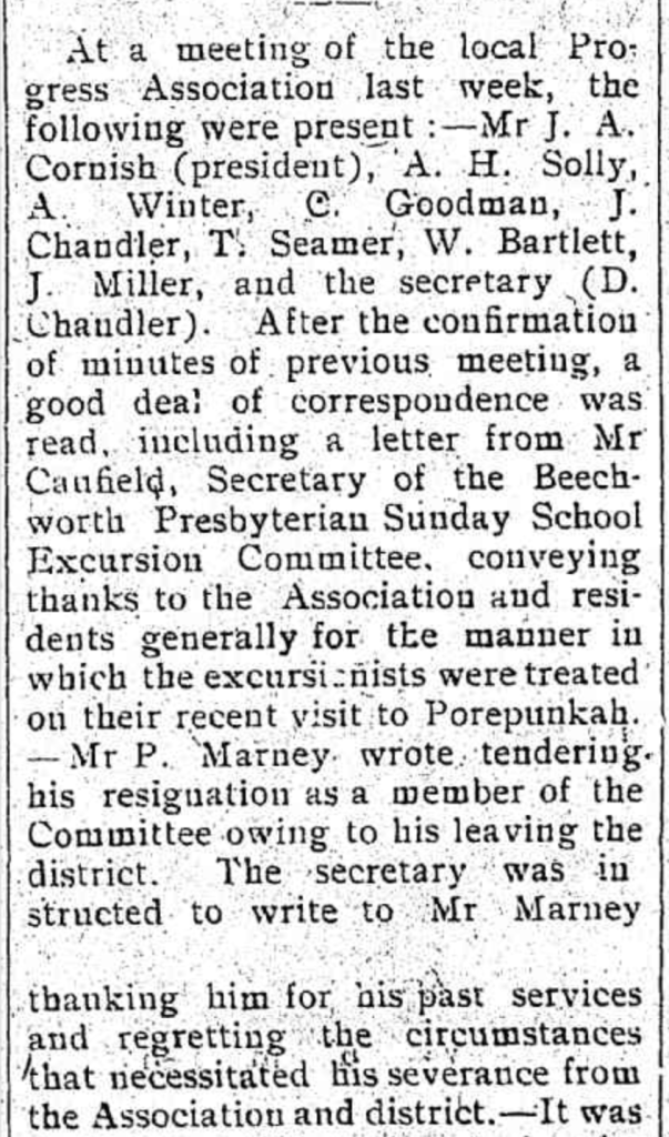 “Myrtleford Mail and Whorouly Witness” (Vic.), Thursday 2 April 1914, page 3 (extract from article: “Porpunkah”).