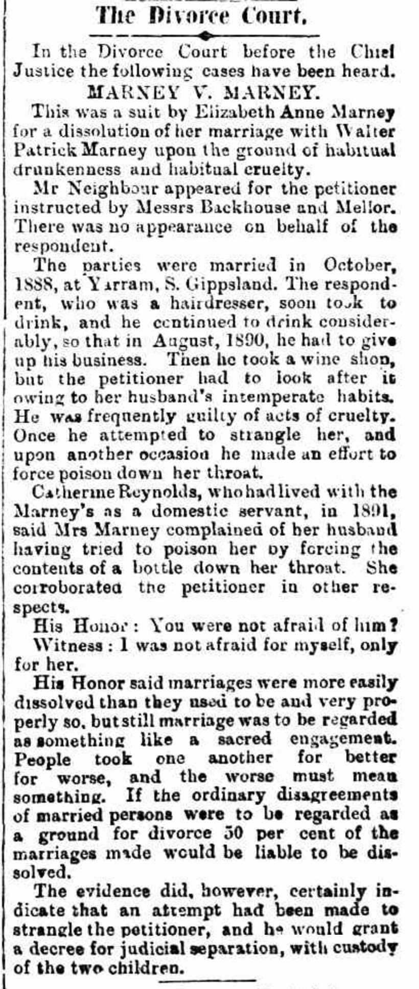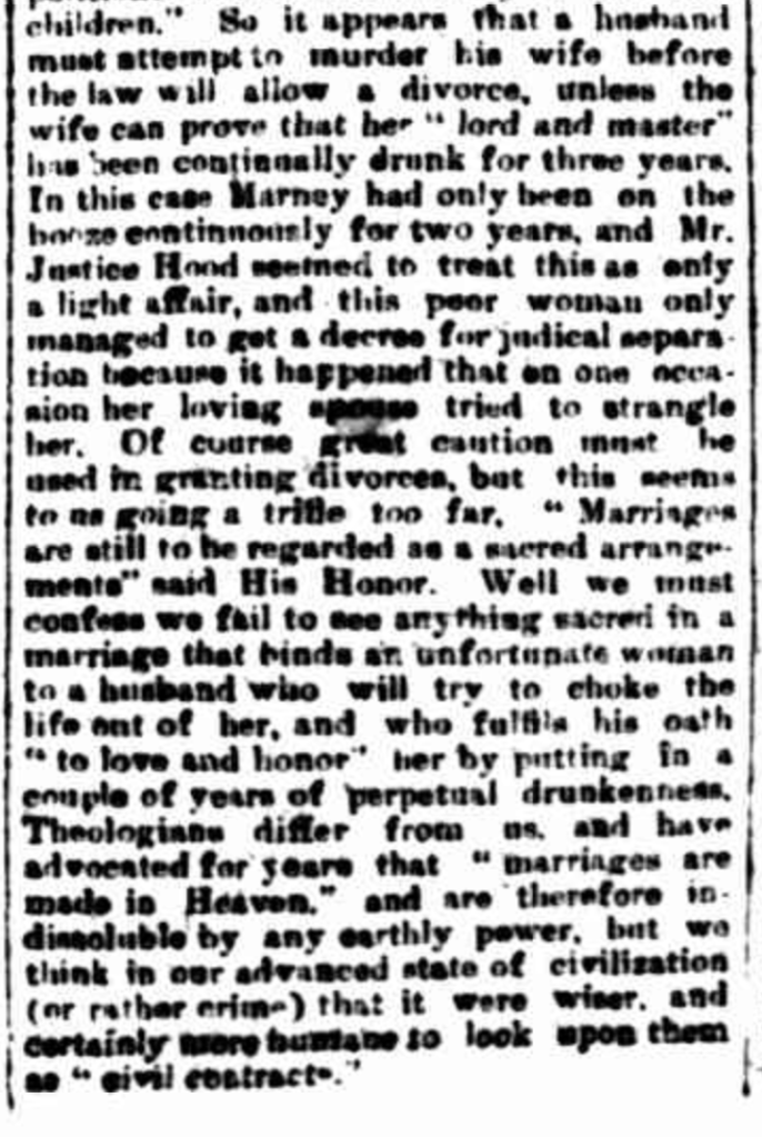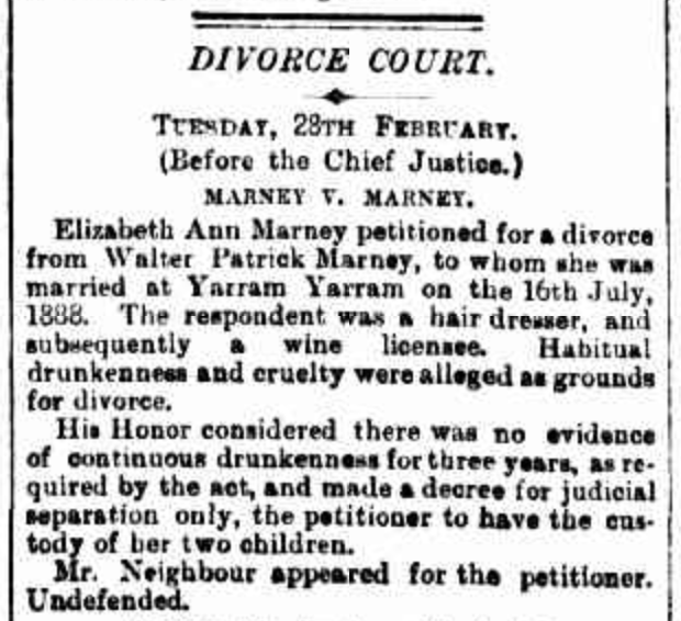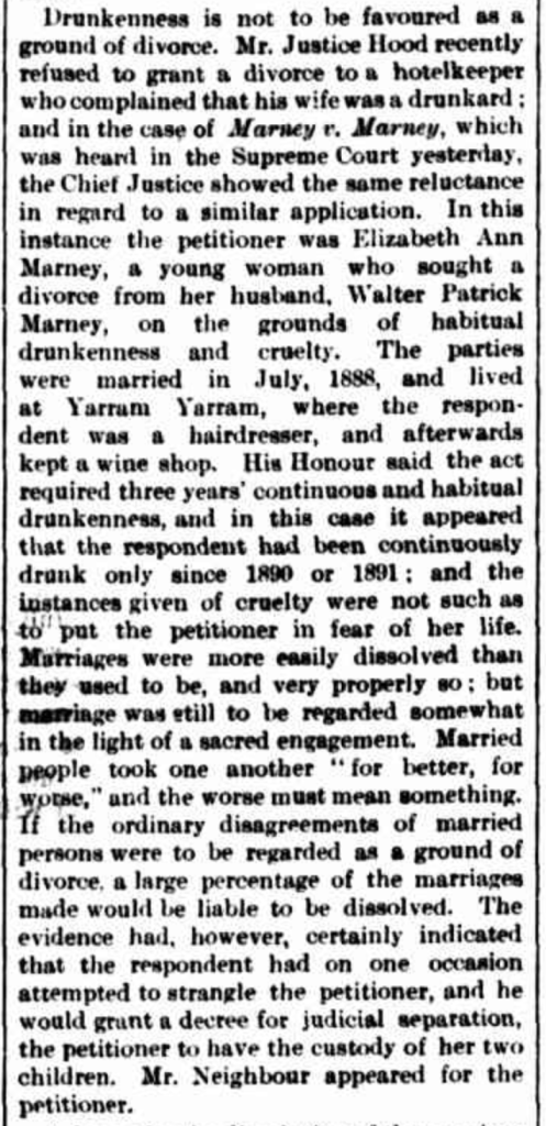 “Argus” (Melbourne Vic.), Wednesday 1 March, 1893, page 5 (extract from editorial). An identical article appeared in “Riverine Herald” (Echuca, Vic./Moama, NSW), Friday, 3 March 1893, page 2 (under the heading “Drunkenness and Divorce”); it also appeared in “Mount Alexander Mail” (Vic.), Saturday 4 March 1893, page 2, without the final sentence (extract from article: “Items of News”).