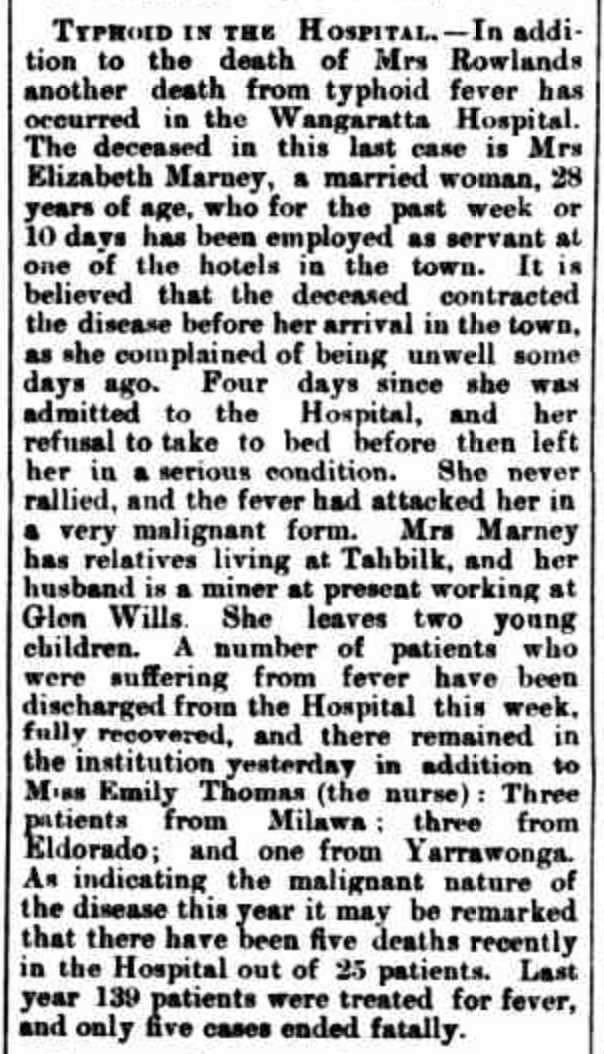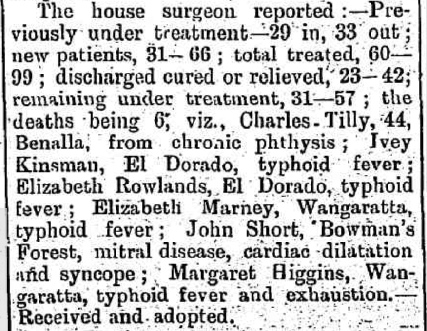 “Ovens and Murray Advertiser” (Beechworth, Vic.), Saturday 11 March 1899, page 1 (extract from article: “Wangaratta District Hospital”).