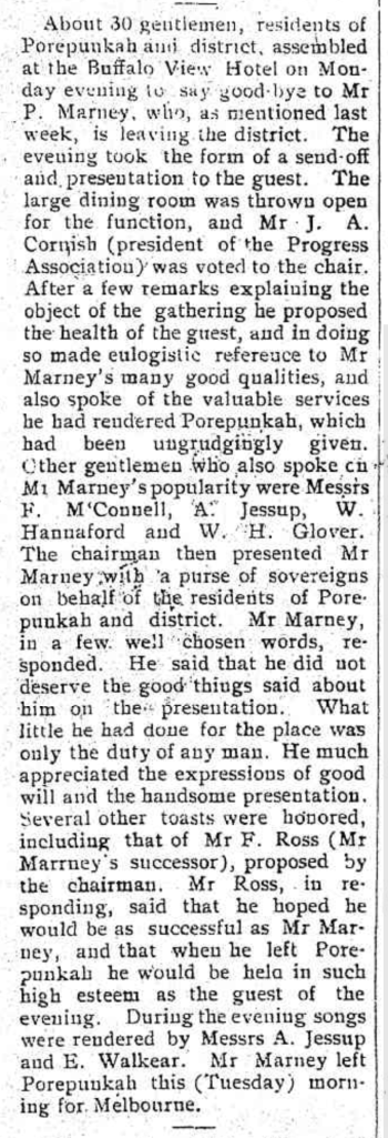 “Myrtleford Mail and Whorouly Witness” (Vic.), Thursday 23 April 1914, page 3 (extract from article: “Porpunkah”).