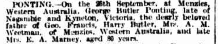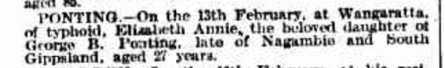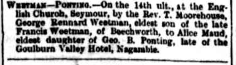 “Australasian” (Melbourne, Vic.), Saturday 7 January 1893, page 46 (Marriages). Note: George Ponting was the father of Elizabeth Marney (Ponting).