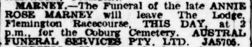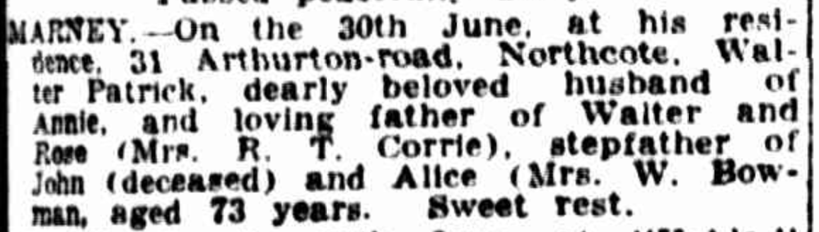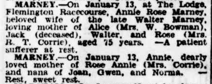 “Age” (Melbourne, Vic.), Wednesday 3 October 1906, page 1 Family Notices). Also published in “Argus” (Melbourne Vic), Wednesday 3 October 1906, page 1; and “Australasian (Melbourne, Vic), Saturday 13 October 1906, page 60.