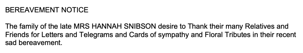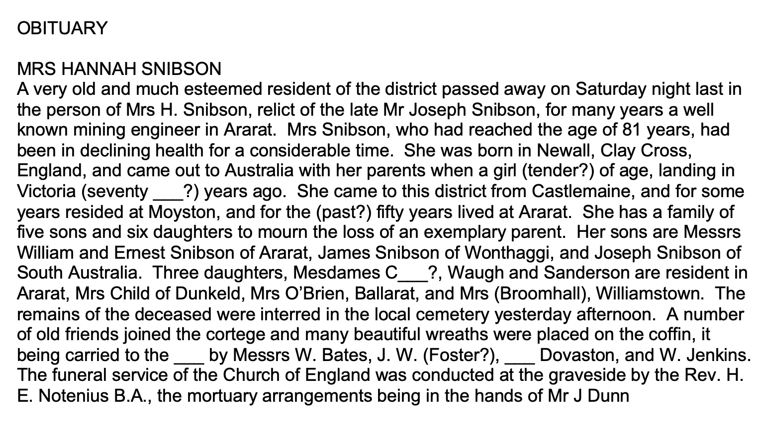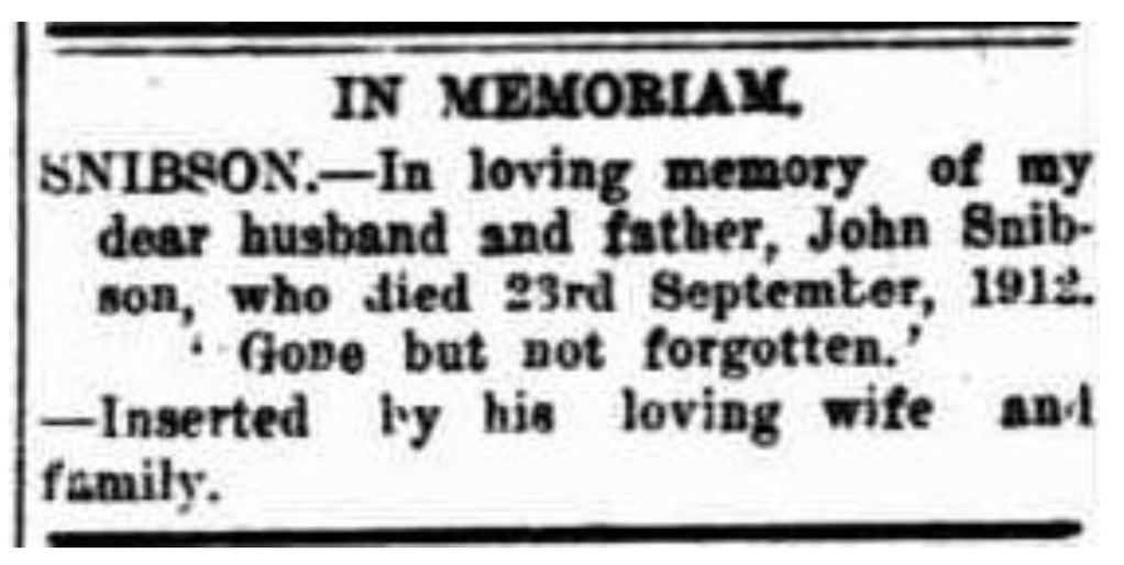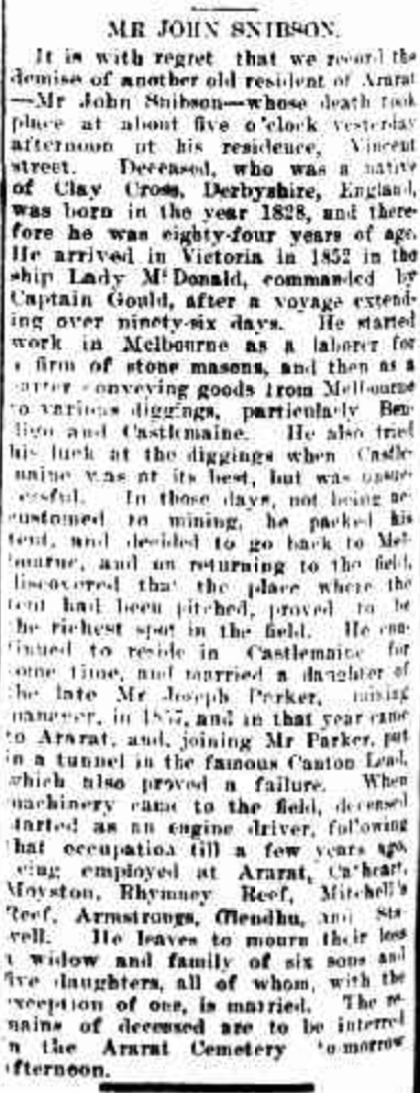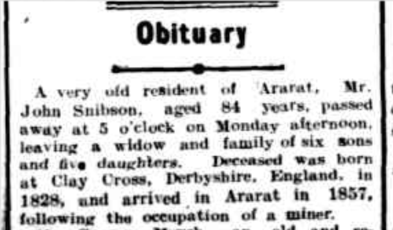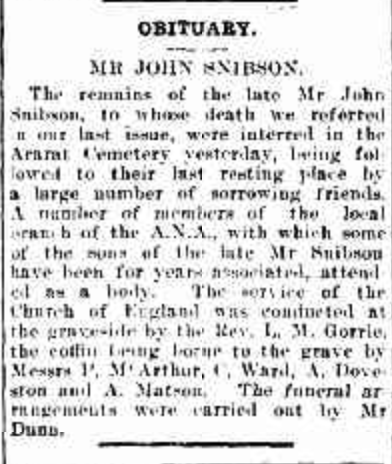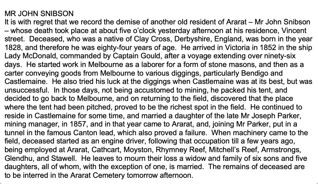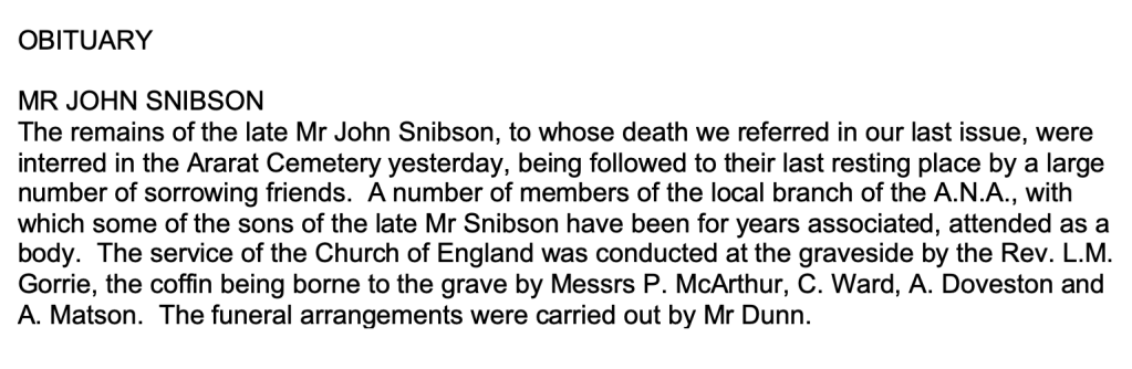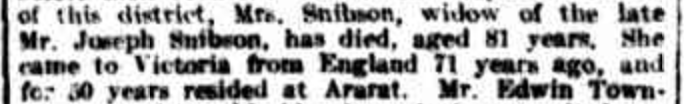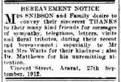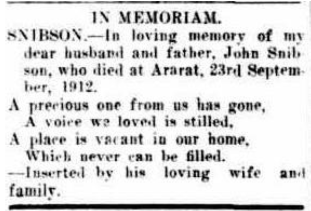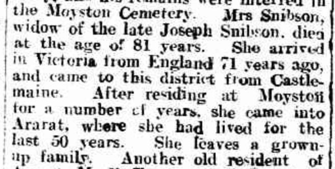 “Ballarat Star” (Vic.), Wednesday 13 December 1922, page 7 (extract from article “Ararat; Deaths”). Note, her husband’s name (John) was incorrectly reported [Trove].