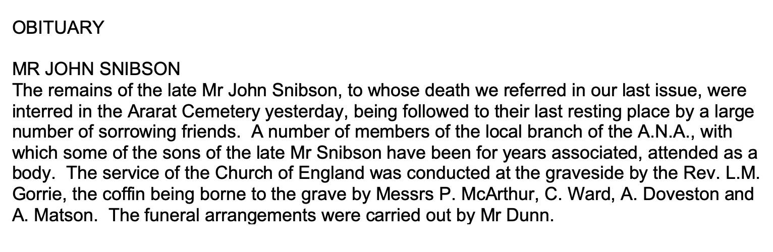 “Ararat Advertiser and Chronicle for the Stawell and Wimmera Districts” ((Vic.), Thursday 23 September 1915, page 2 [Trove].“Ararat Advertiser and Chronicle for the Stawell and Wimmera Districts” ((Vic.), Saturday 23 September 1916, page 2 [Trove].“Ararat Advertiser” (Vic.), Tuesday 24 September 1918, page 2 [Trove].“Ararat Advertiser” (Vic.), Tuesday 12 December 1922, page 2.